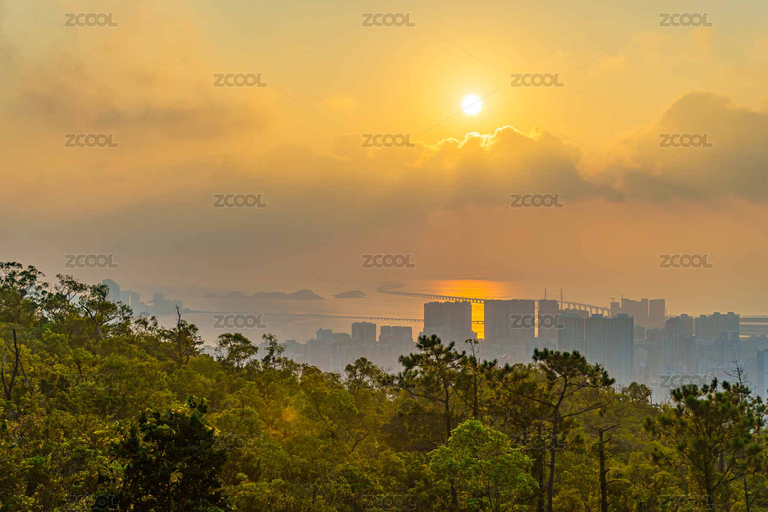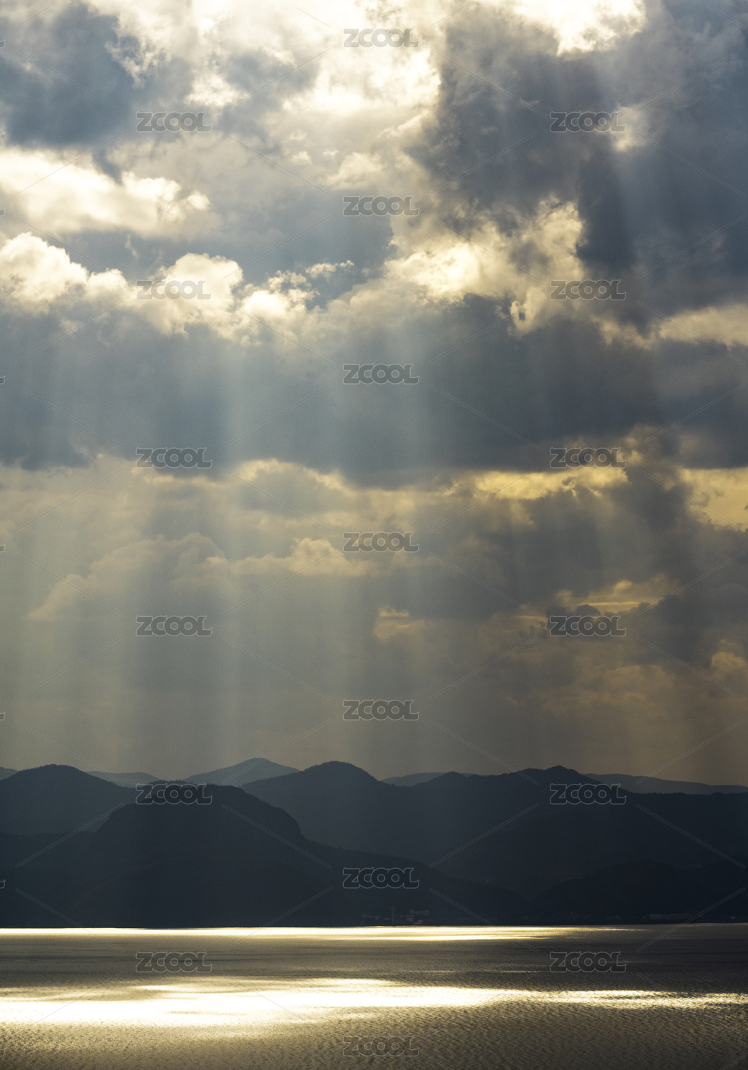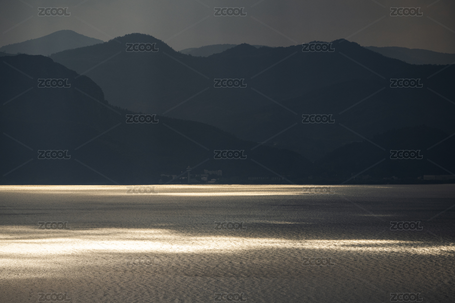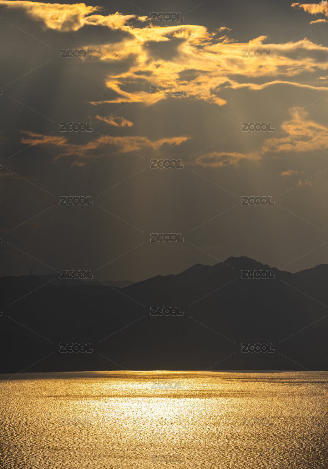 夕陽金光照耀下的云南撫仙湖的湖光山色