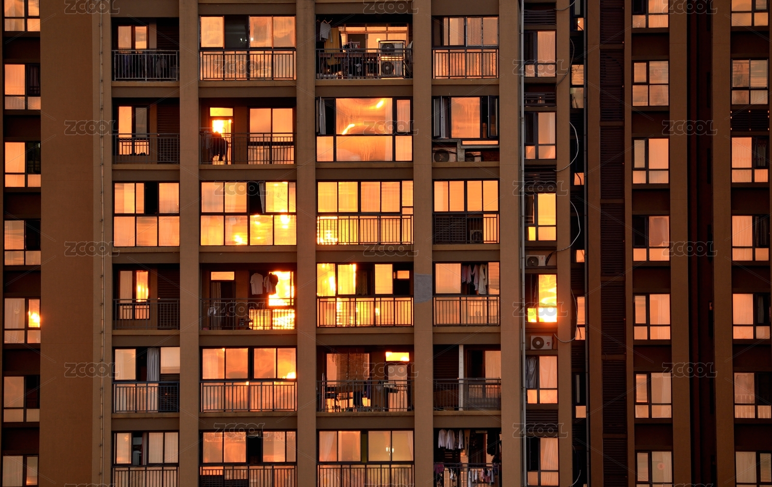 反射夕陽金光的高層住宅樓玻璃外墻面