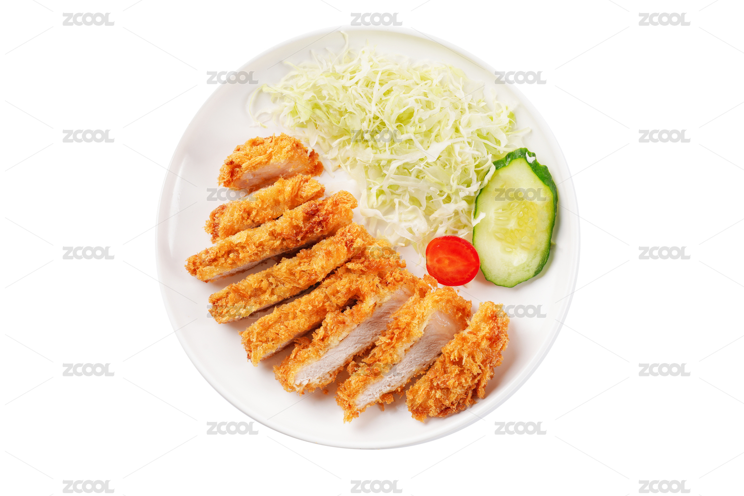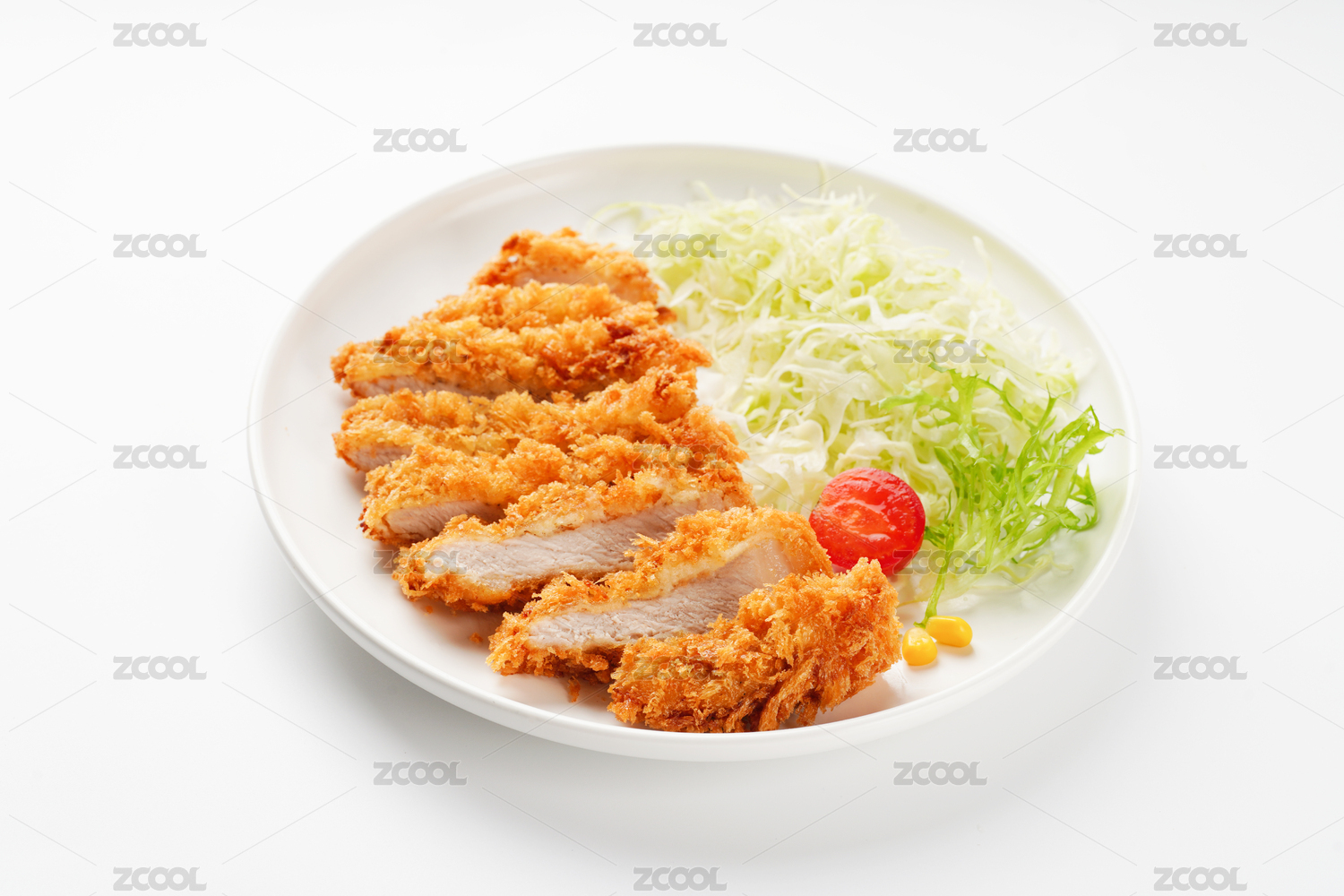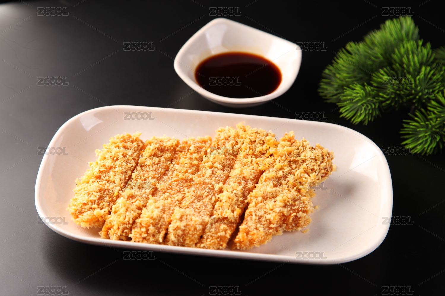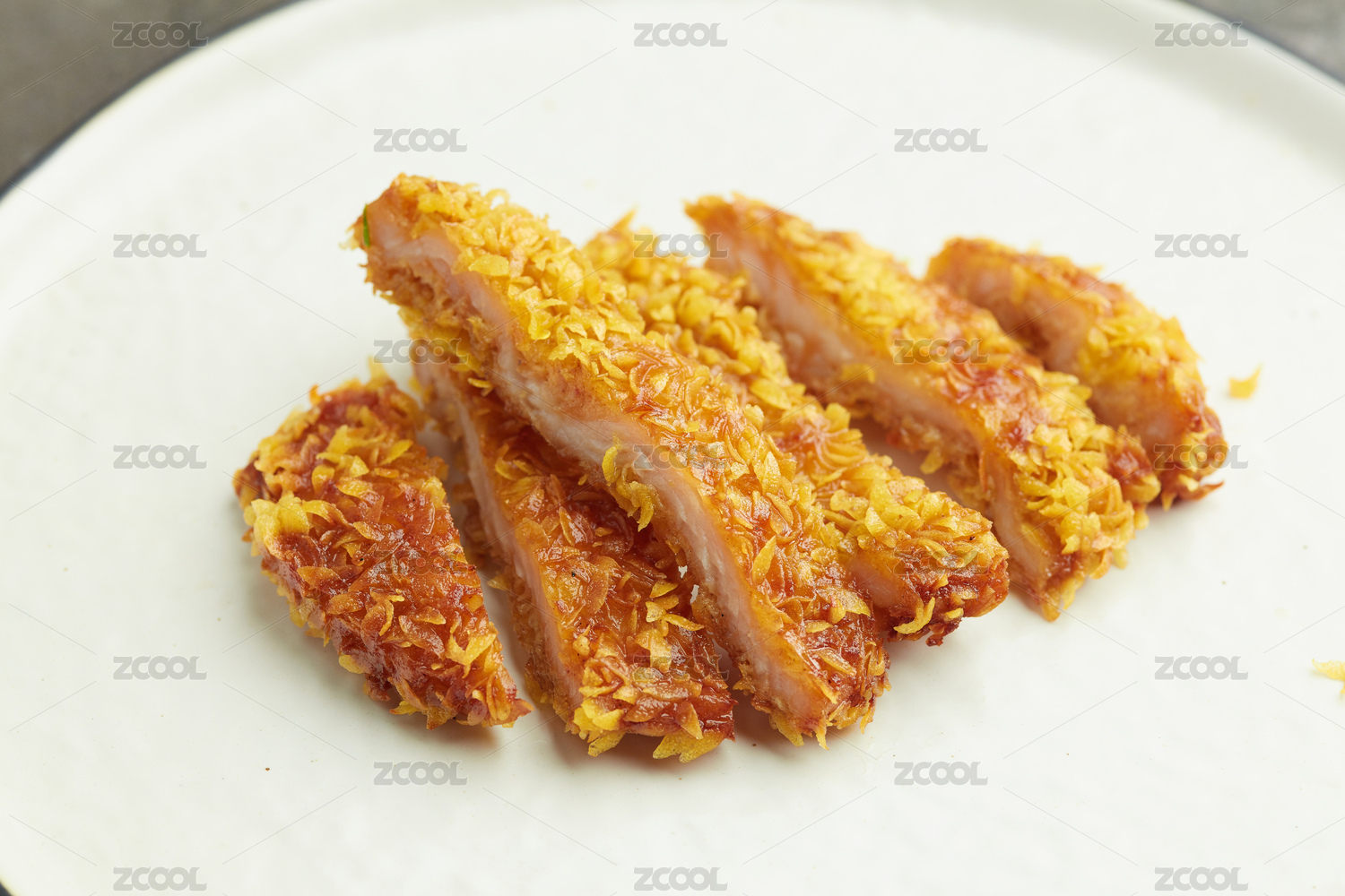 青色瓷盤裝的黃金炸豬排擺放在麻布?jí)|子上
