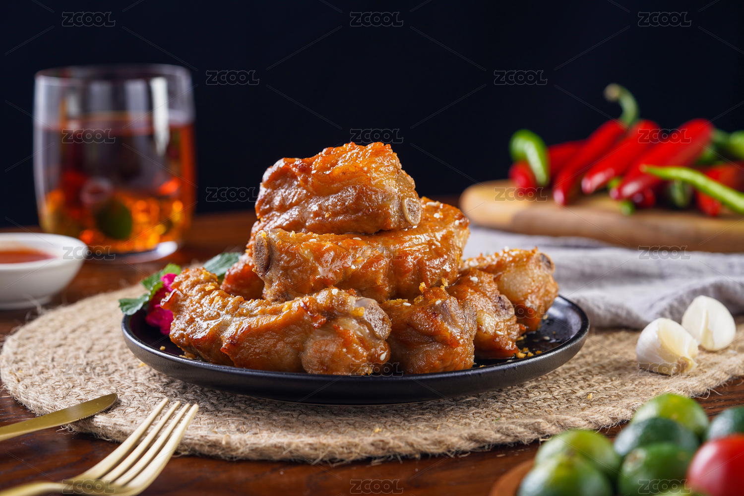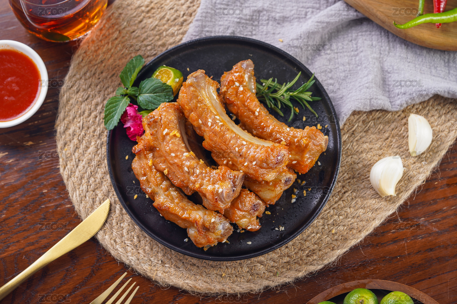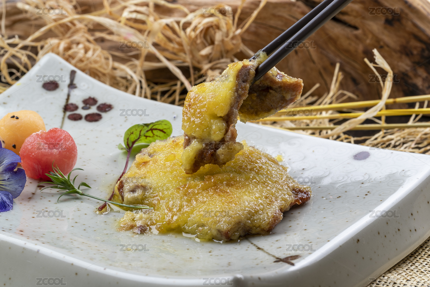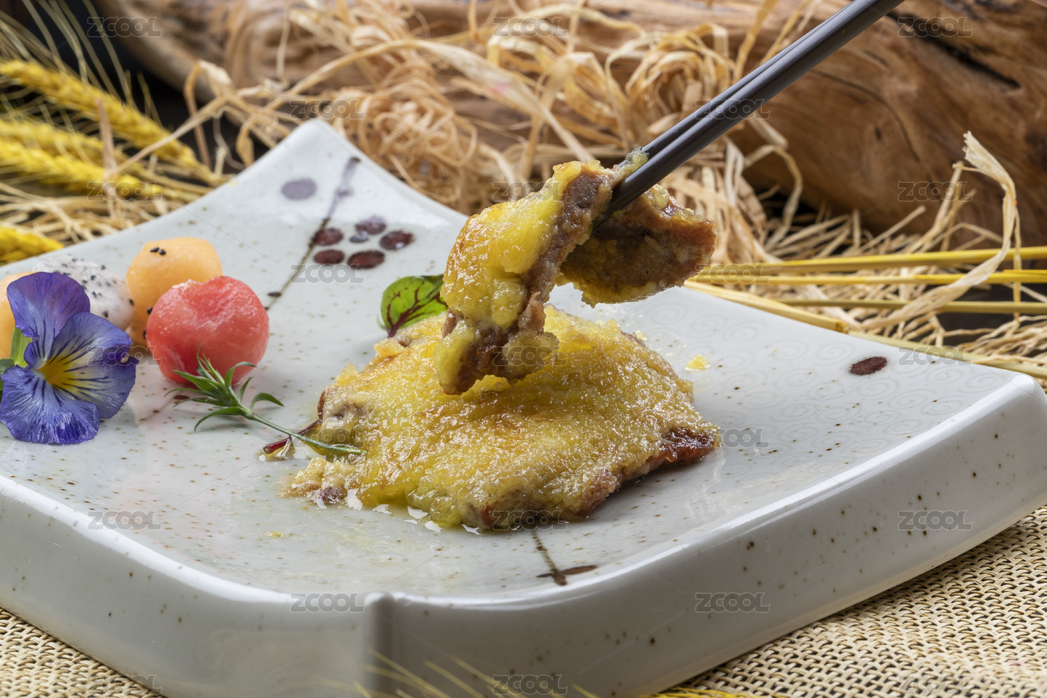 青色瓷盤裝的黃金炸豬排擺放在麻布?jí)|子上