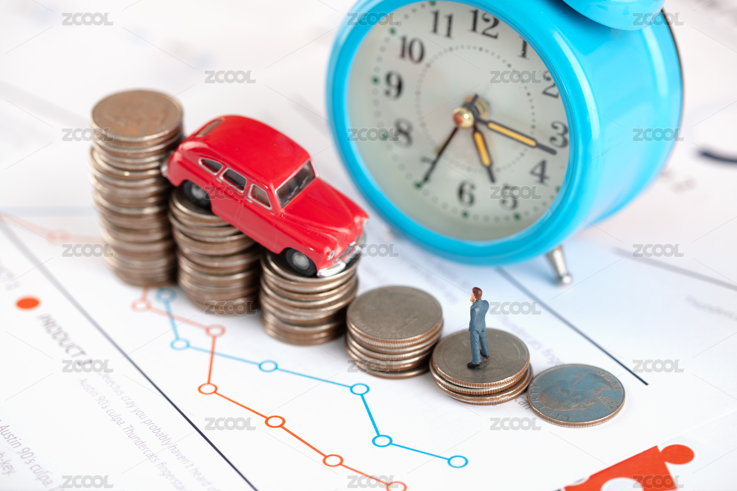 藍(lán)色背景中放在牢籠中的汽車和貨幣符號(hào)微縮