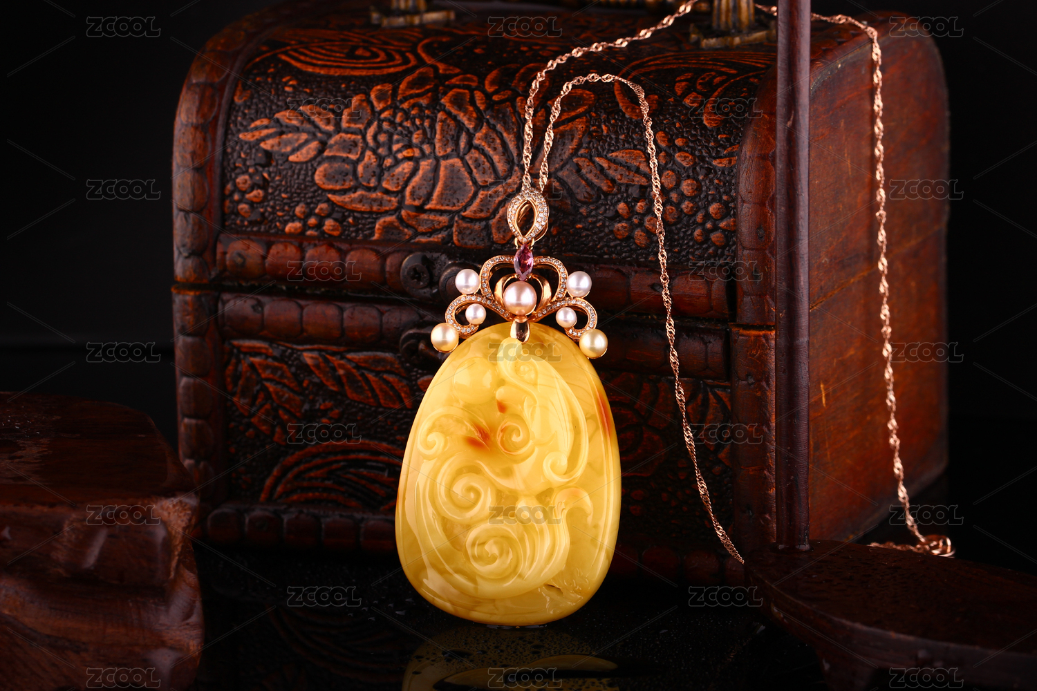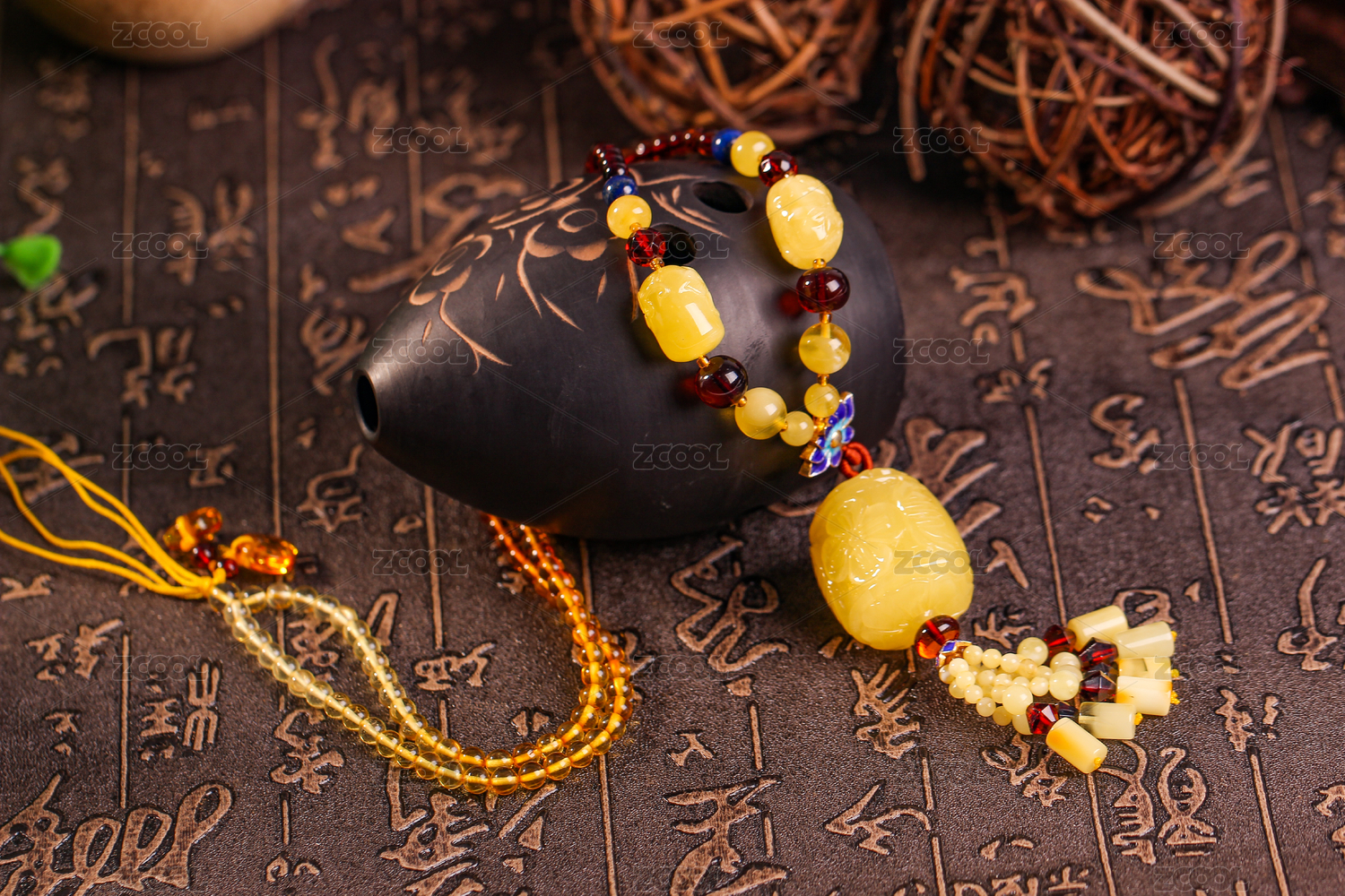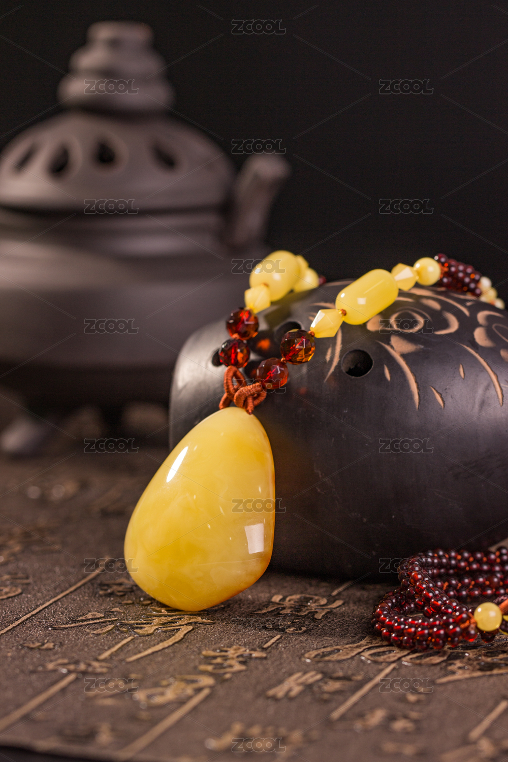 琥珀蜜蠟項鏈吊墜雞油黃色中式復(fù)古佛家禪意的天然珠寶在深色背景中 文藝風(fēng)格