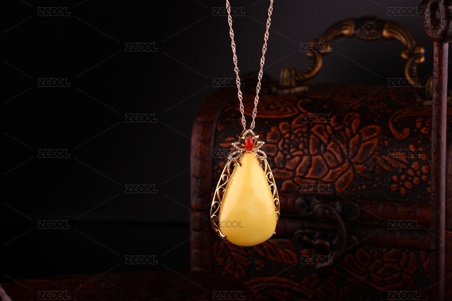 琥珀蜜蠟鑲嵌18K金項鏈吊墜雞油黃色中式復(fù)古佛家禪意的天然珠寶在深色背景中