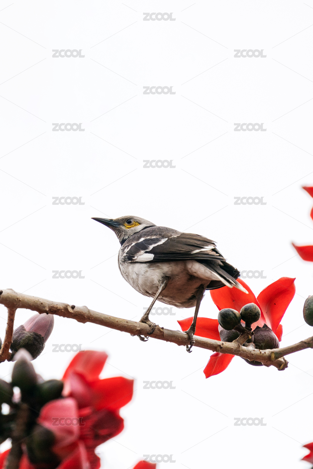 一只黑領(lǐng)椋鳥(niǎo)站立在木棉花樹(shù)上吸食花蜜