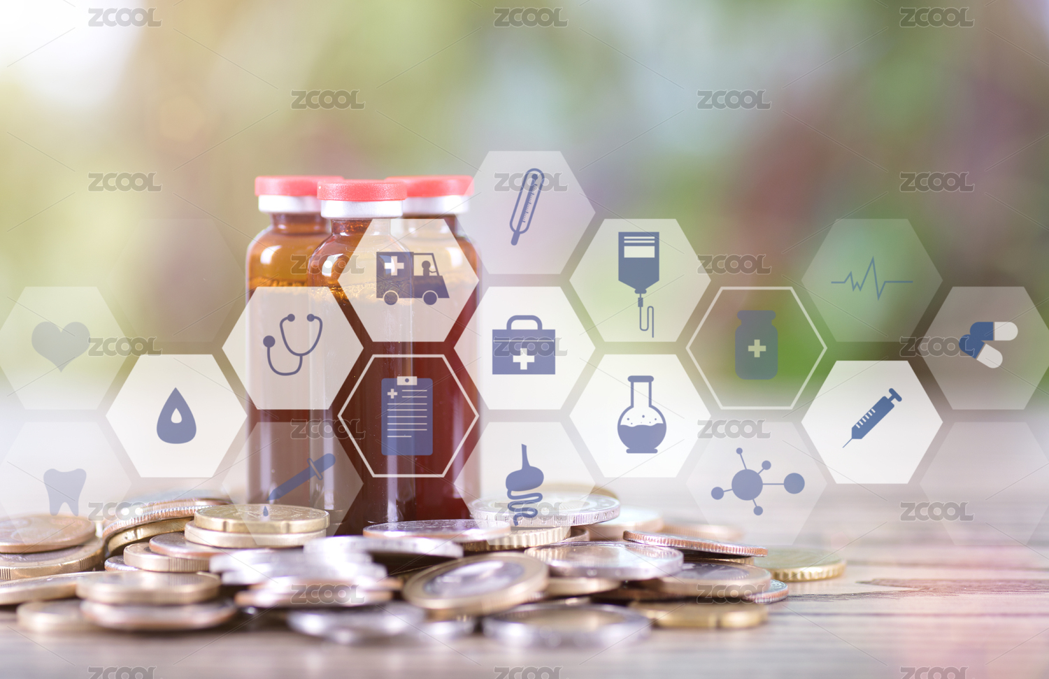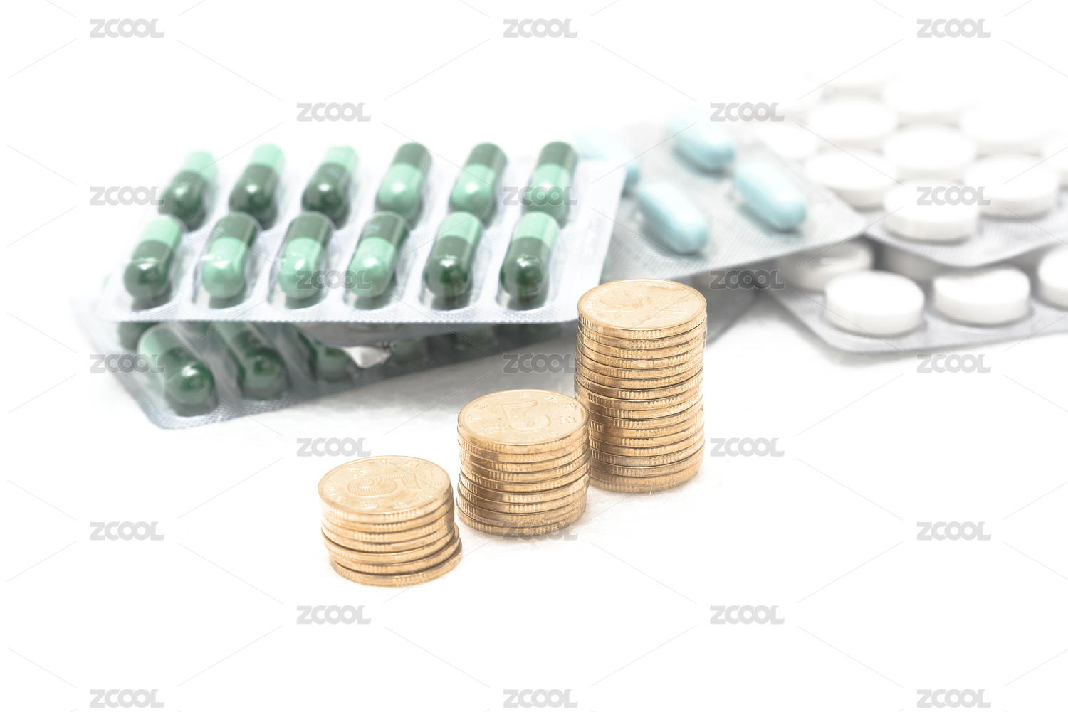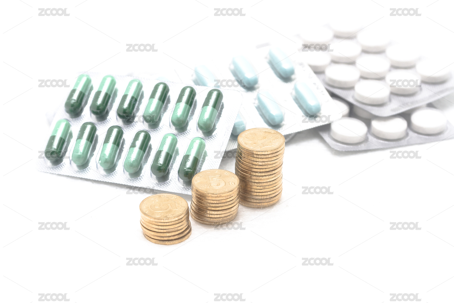 膠囊、藥品與硬幣在一起,醫(yī)療健康、醫(yī)保概念創(chuàng)意圖