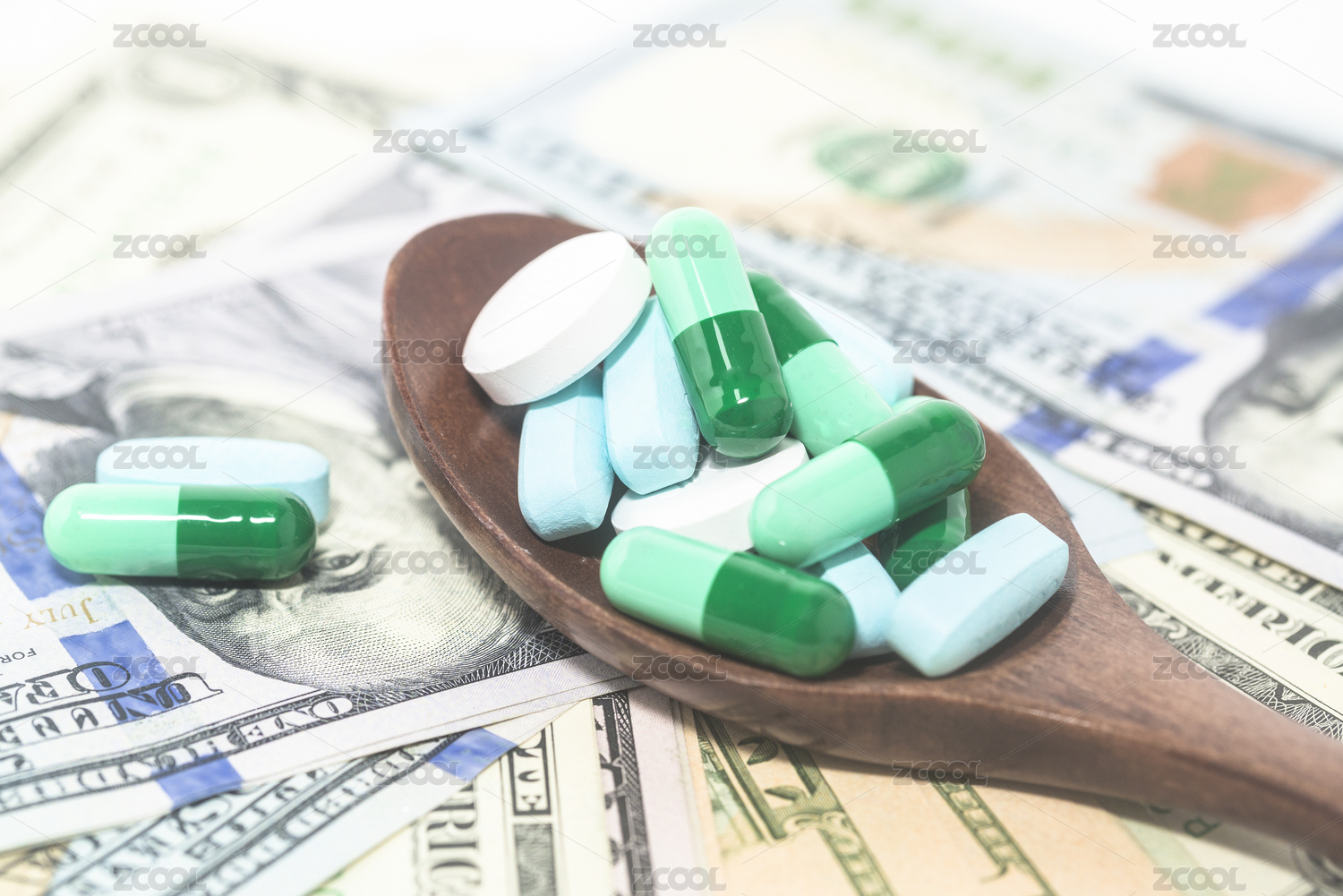 膠囊、藥片、藥品與美金放在一起,醫(yī)療健康,醫(yī)保概念創(chuàng)意圖