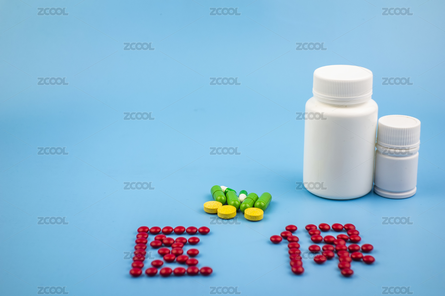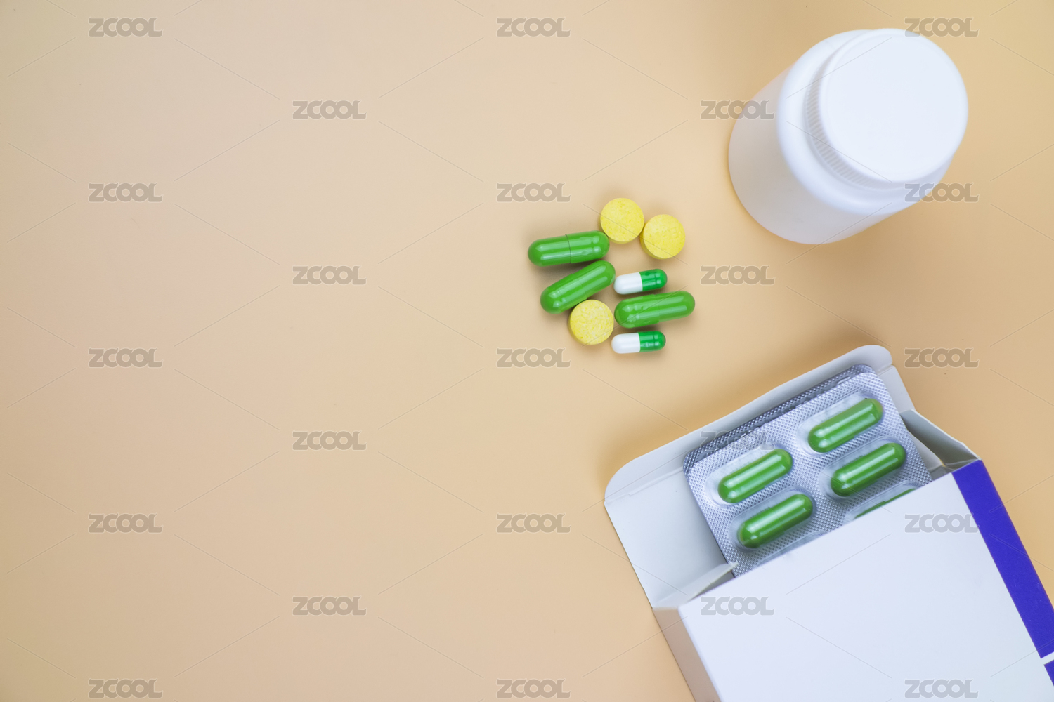 各類藥品放在綠色的背景中