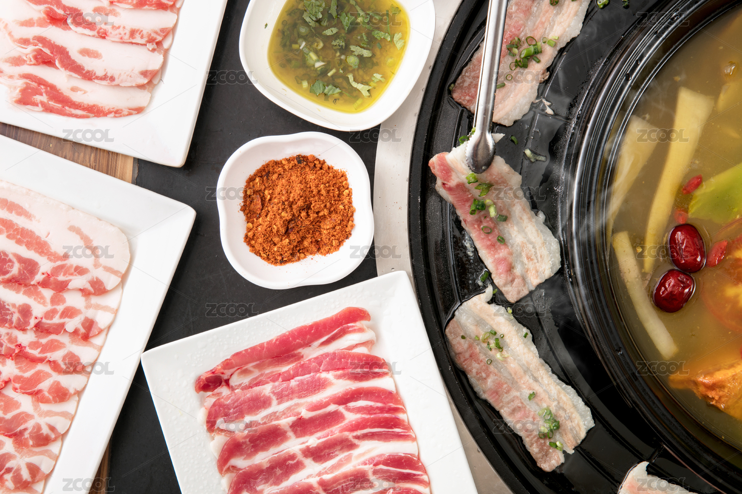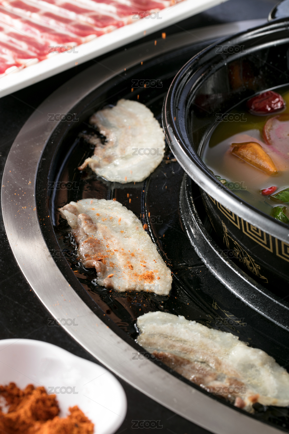 湯鍋邊上鍋邊烤五花肉片