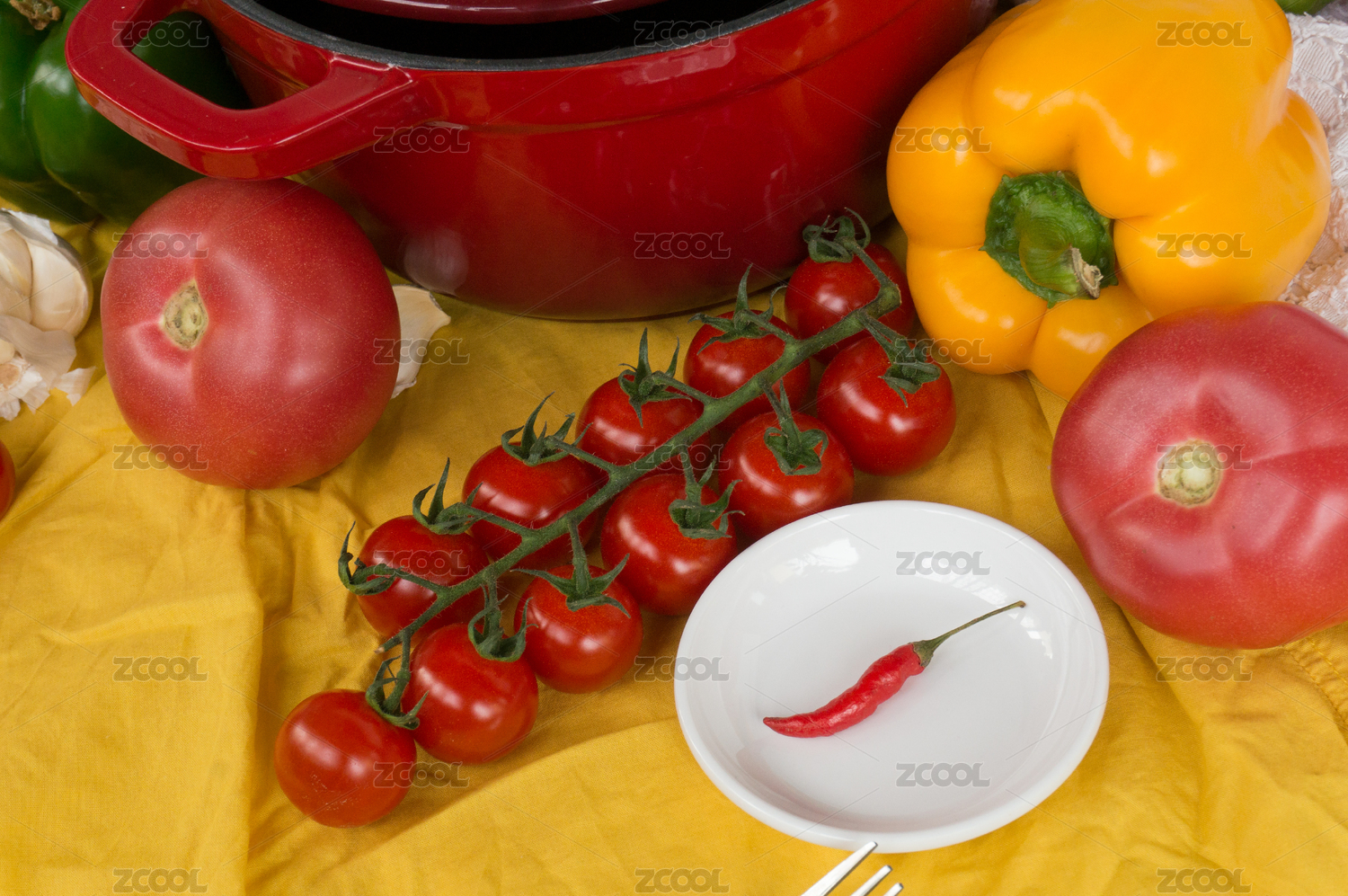 番茄辣椒放在紅色鑄鐵鍋邊
