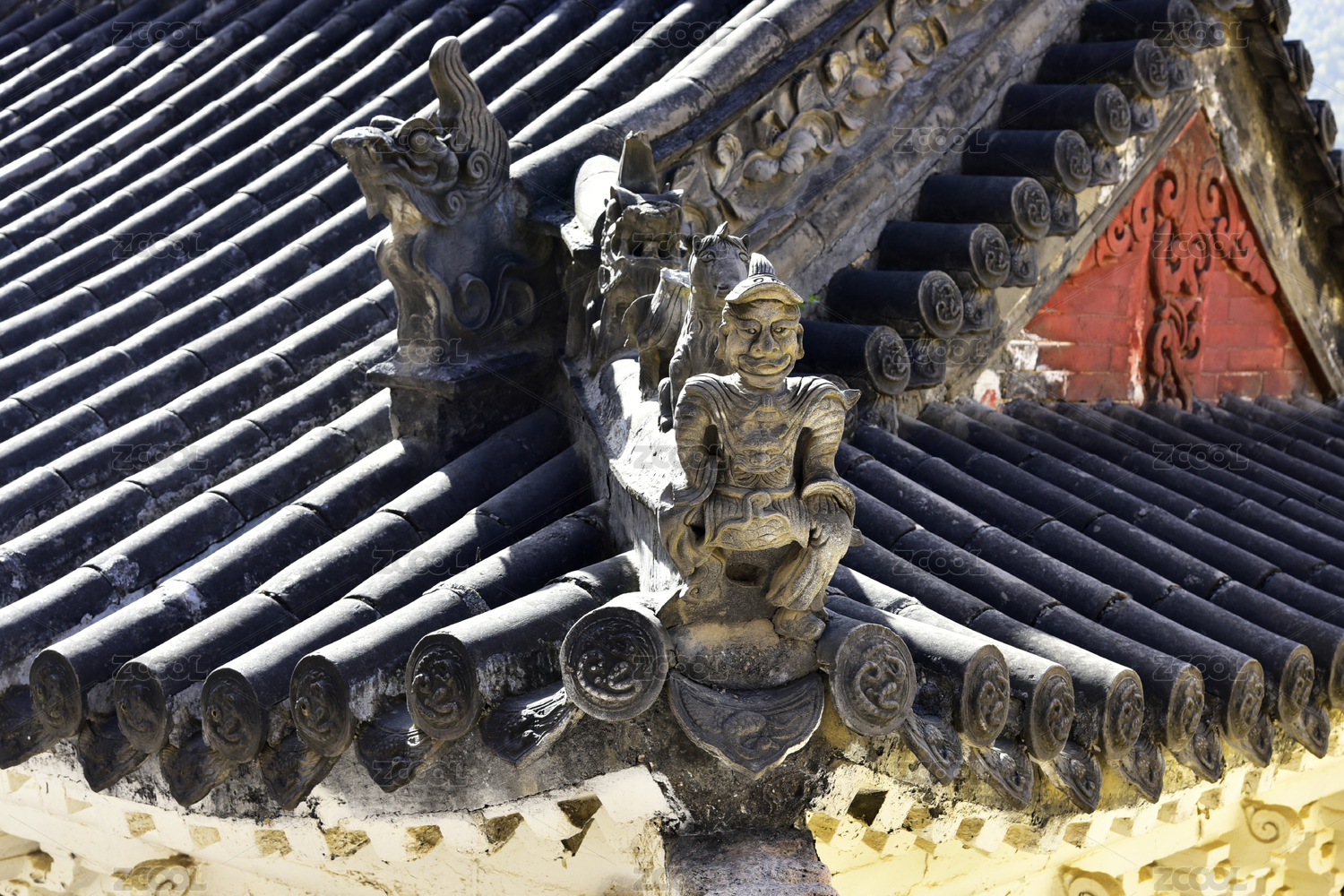 山西省五臺山顯通寺佛堂飛檐上的磚雕仙人走獸