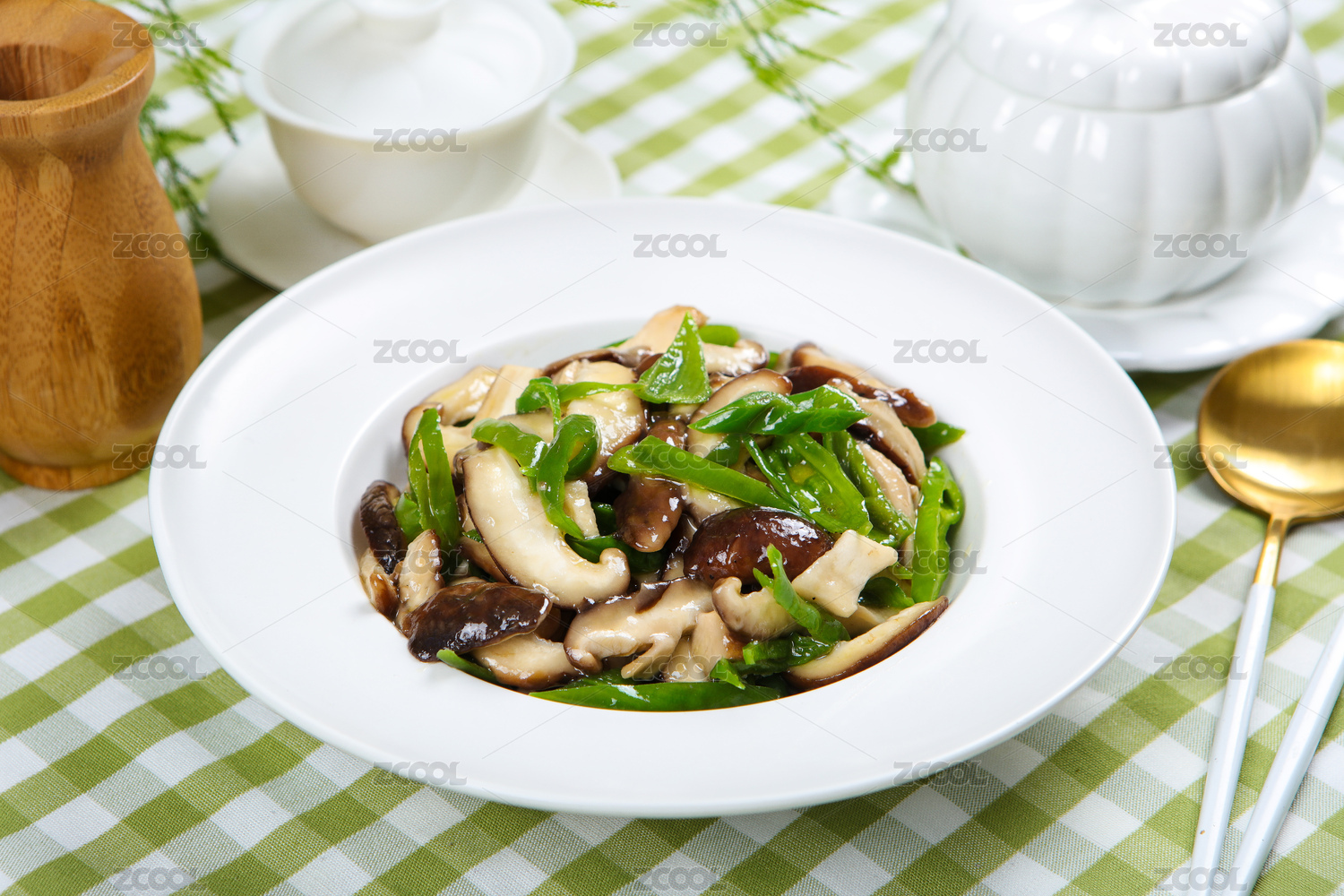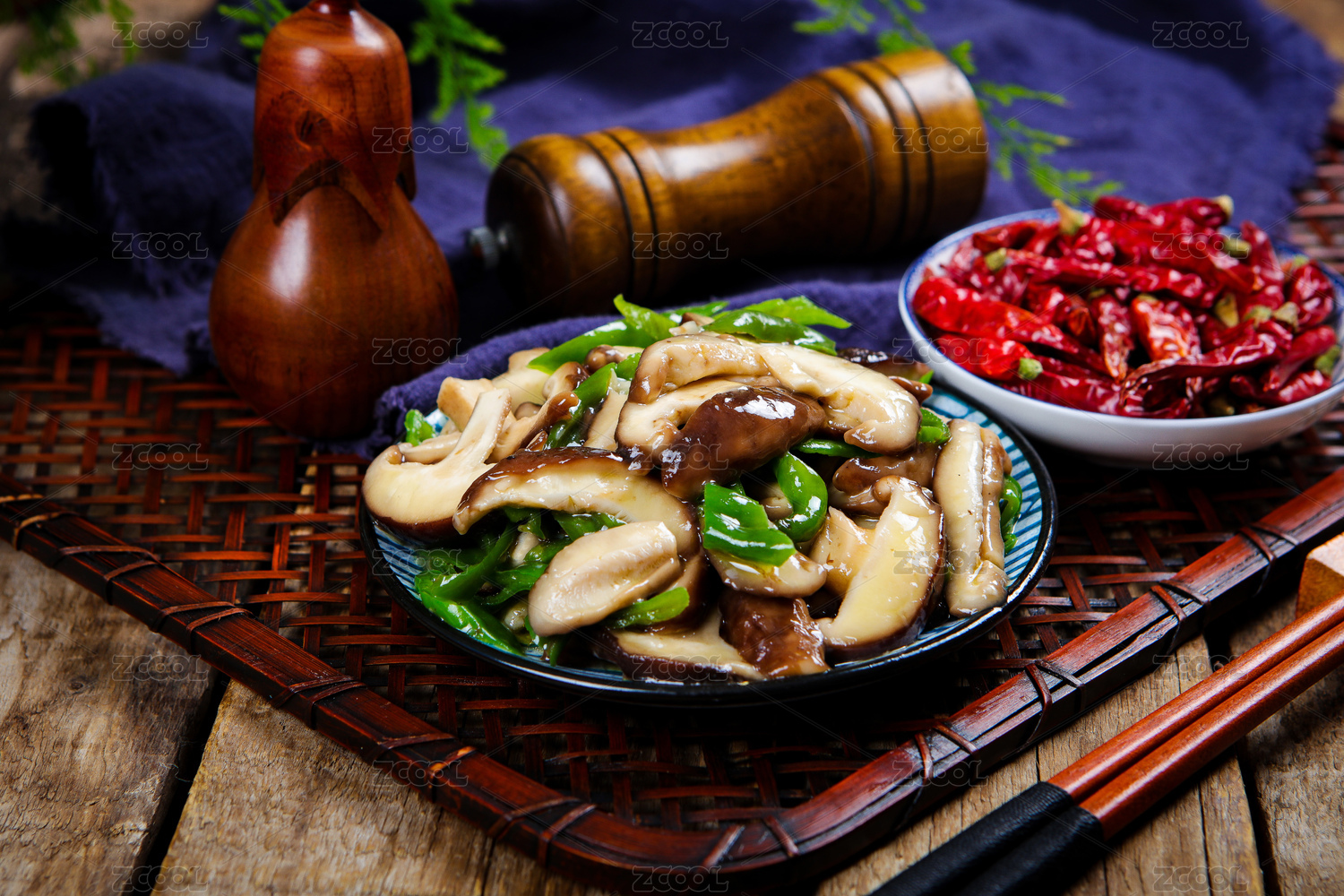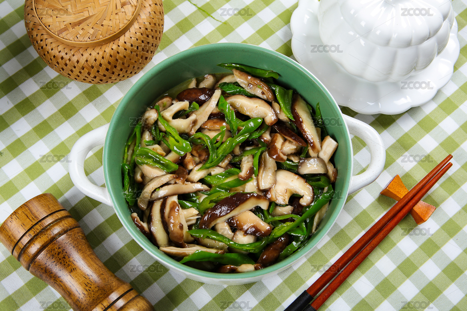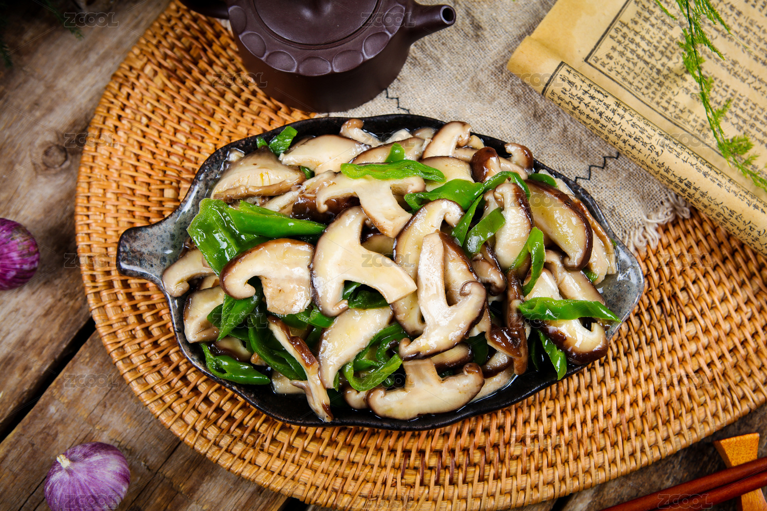放在實(shí)木桌上的銀鍋香菇炒青椒
