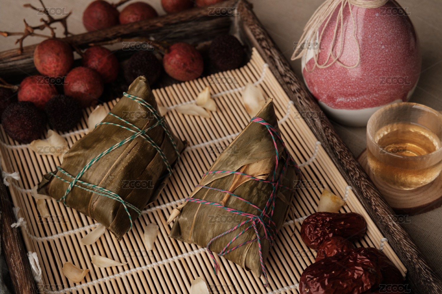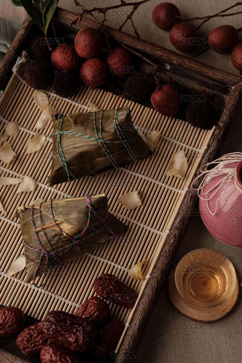木盤(pán)中竹簾上的兩支粽子若干荔枝百合黃酒罐