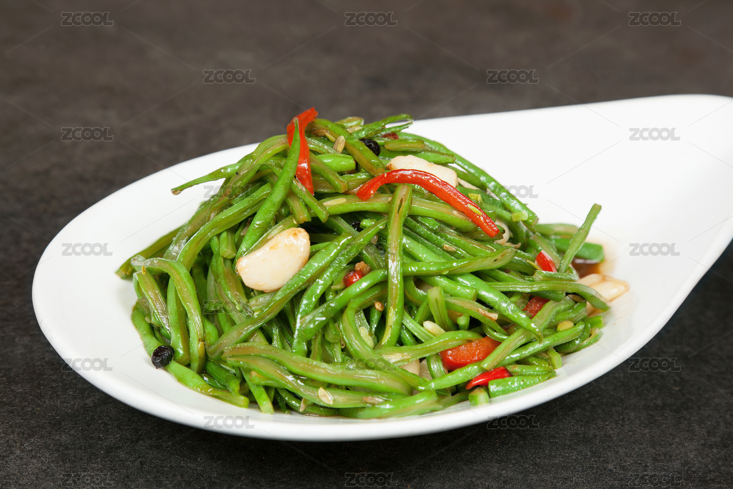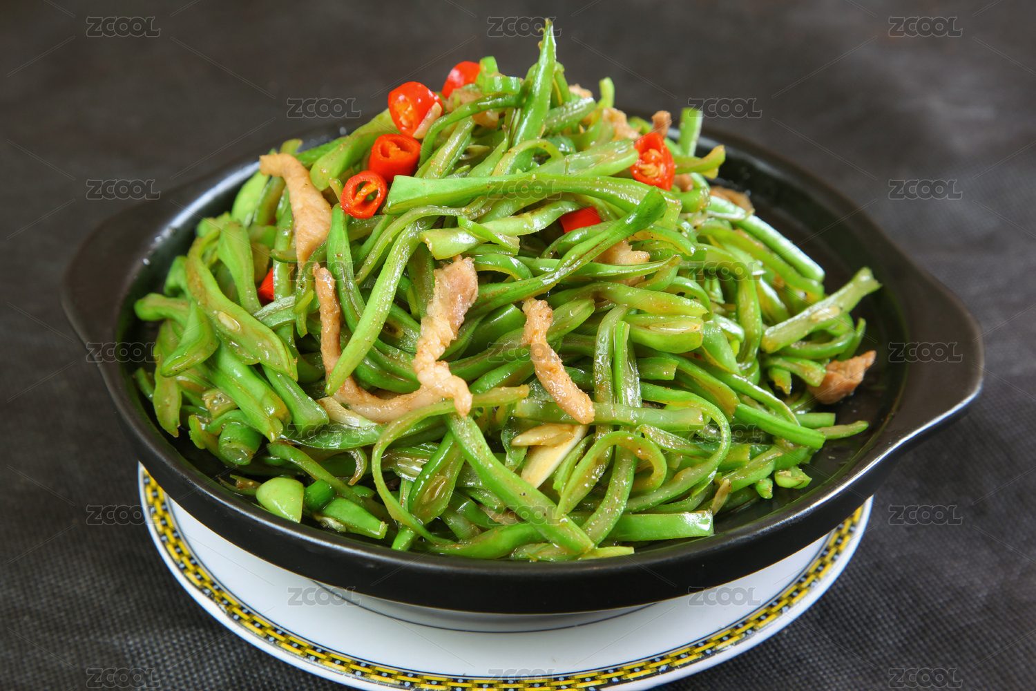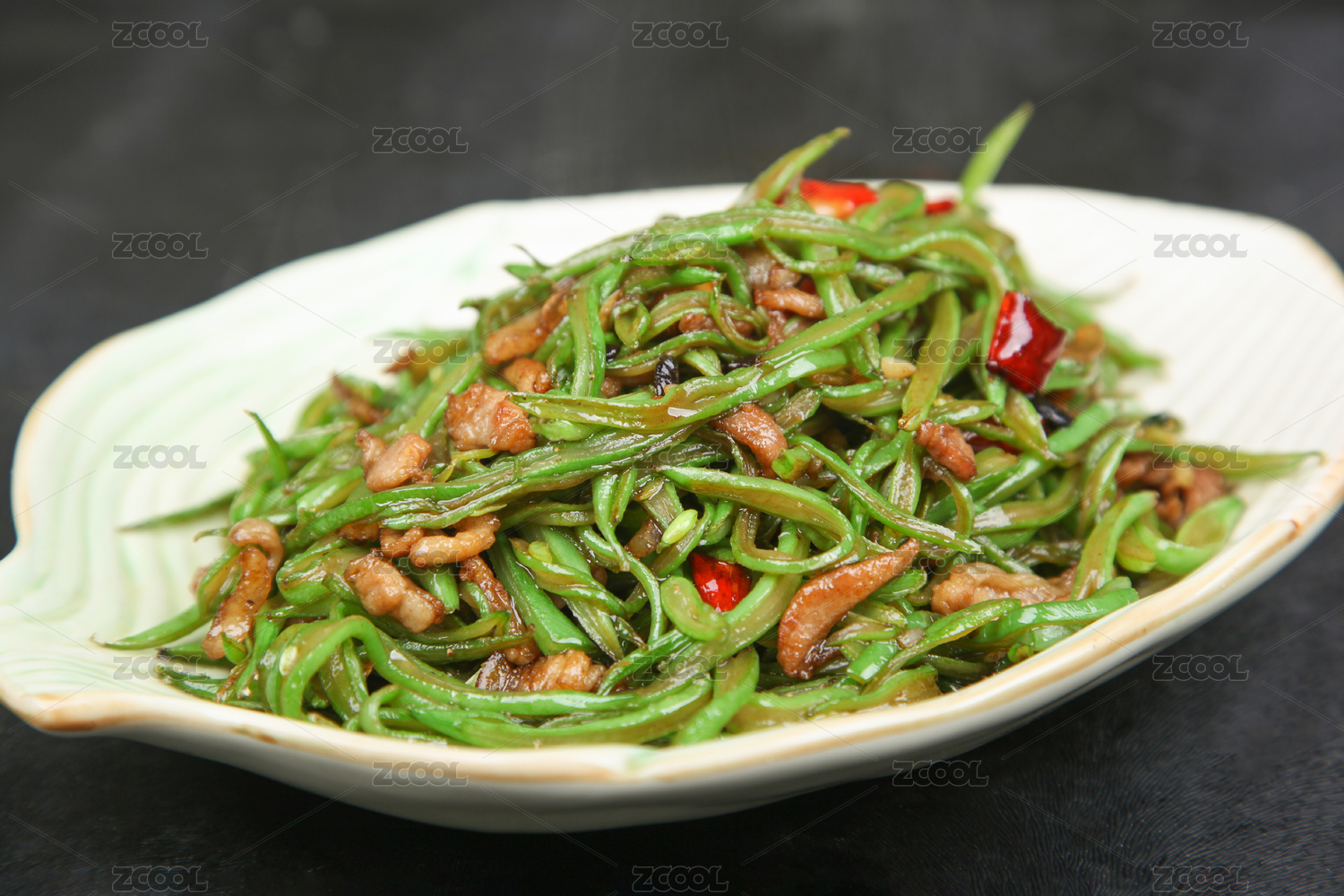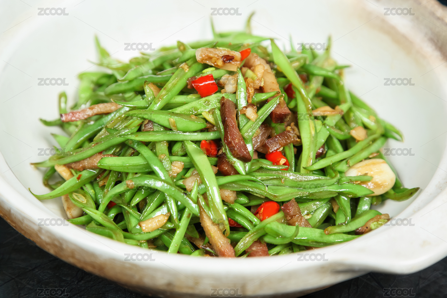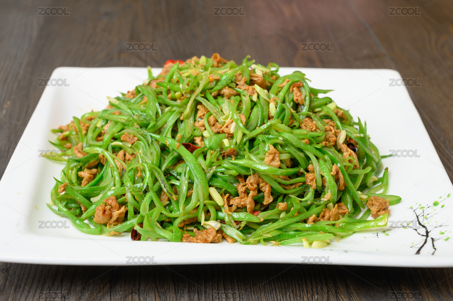 白色背景下的一盤香辣湖南菜,扁豆絲