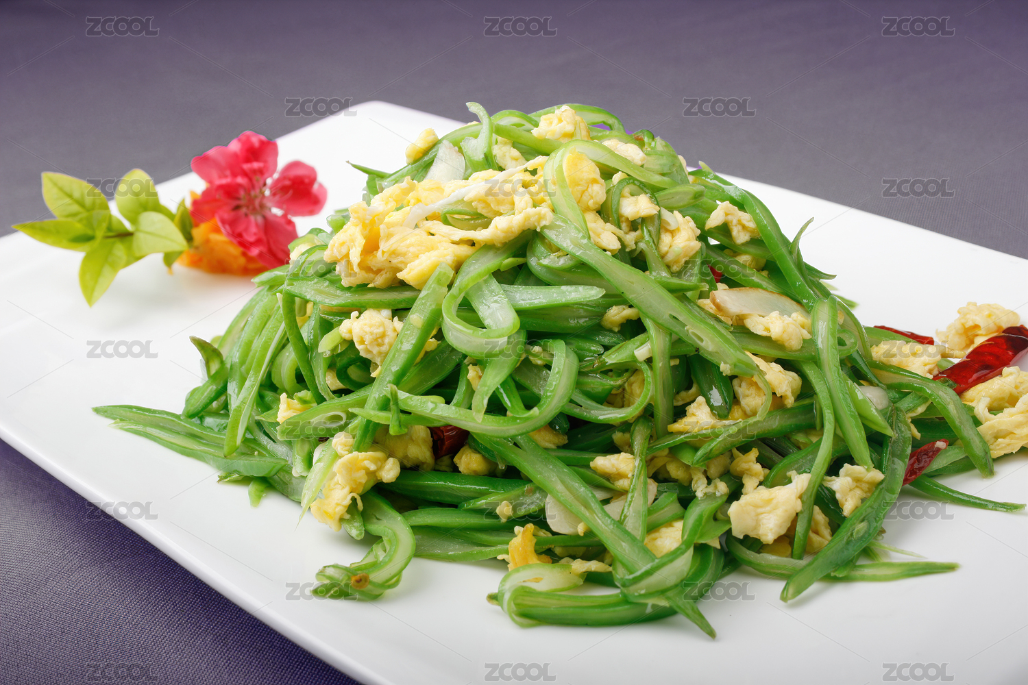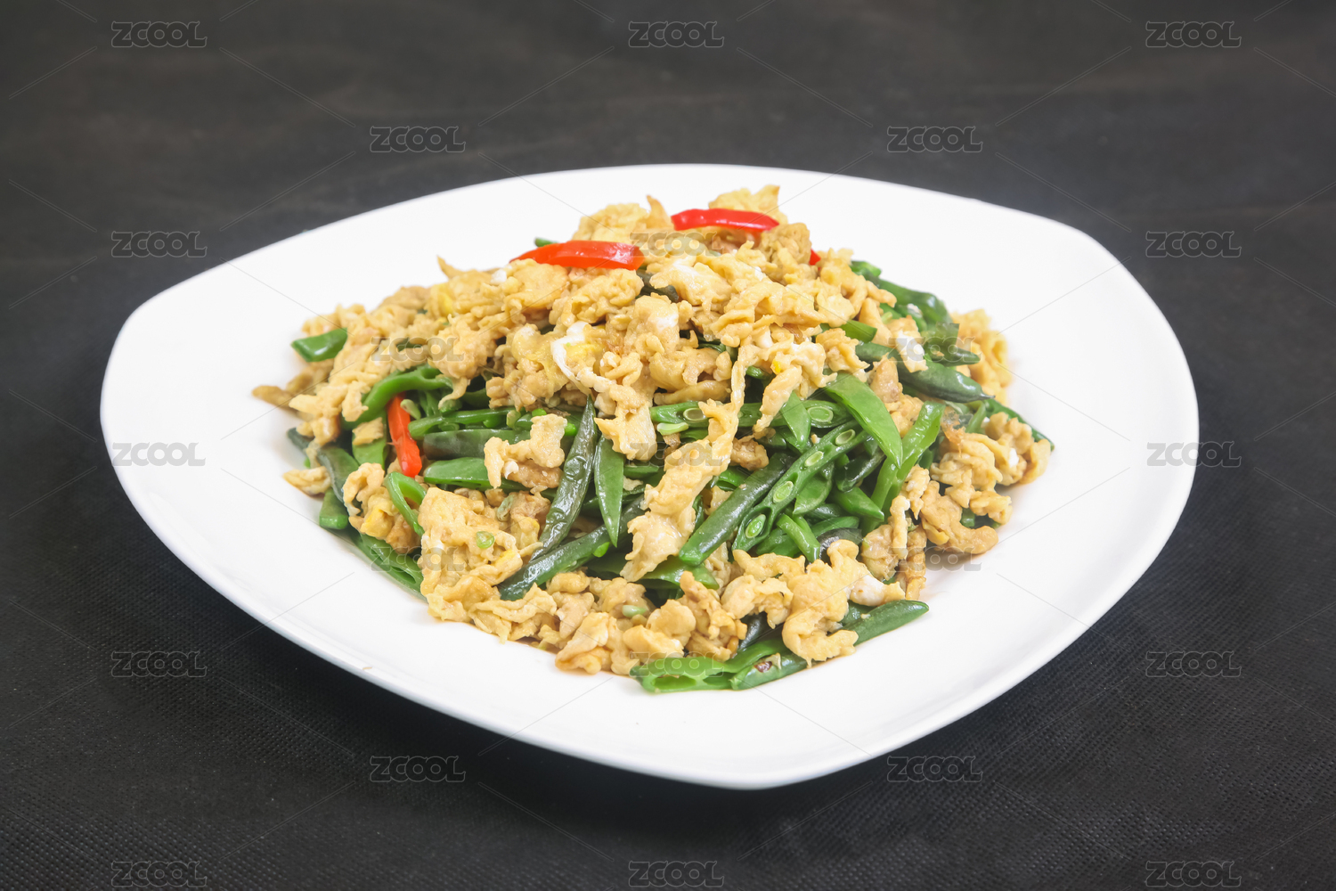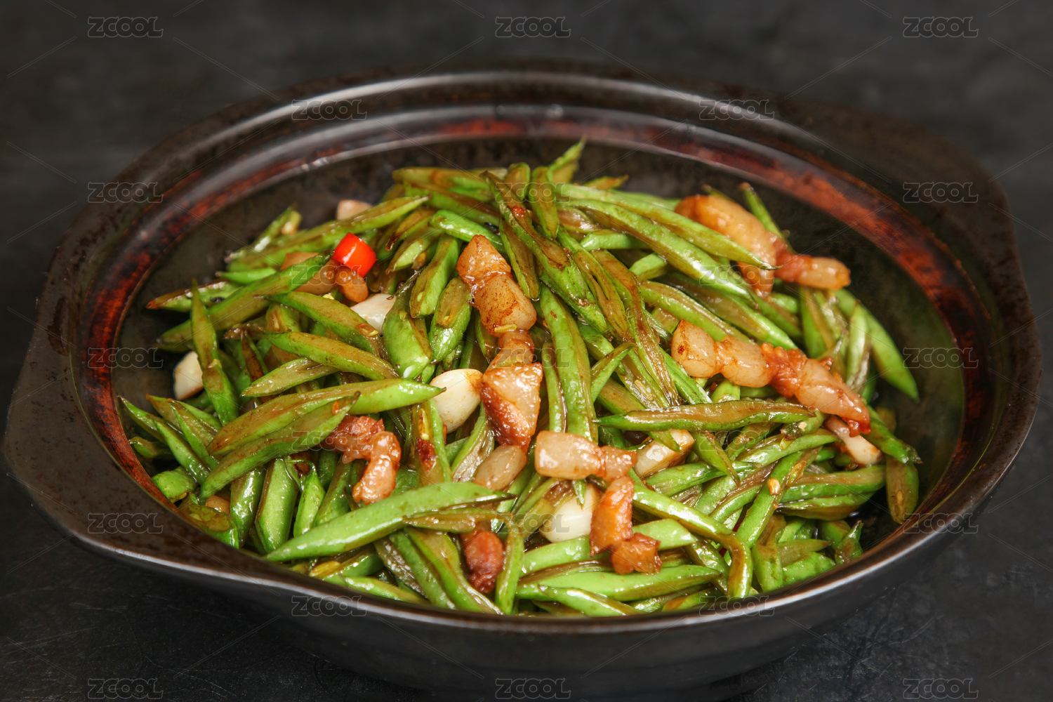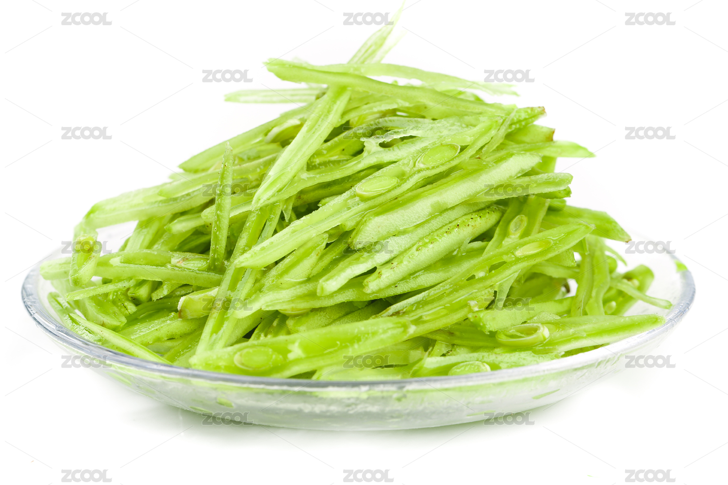 白色背景下的一盤香辣湖南菜,扁豆絲