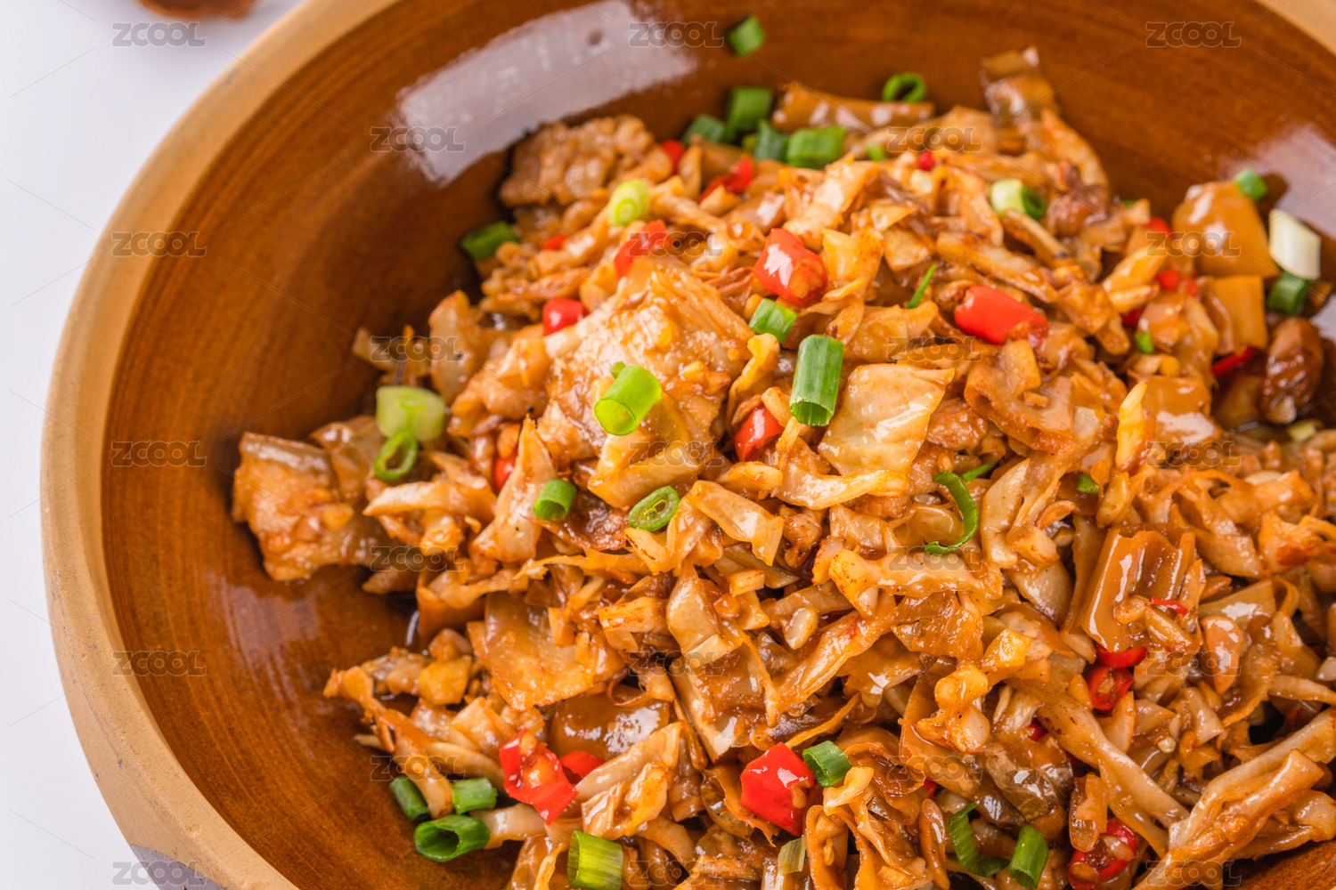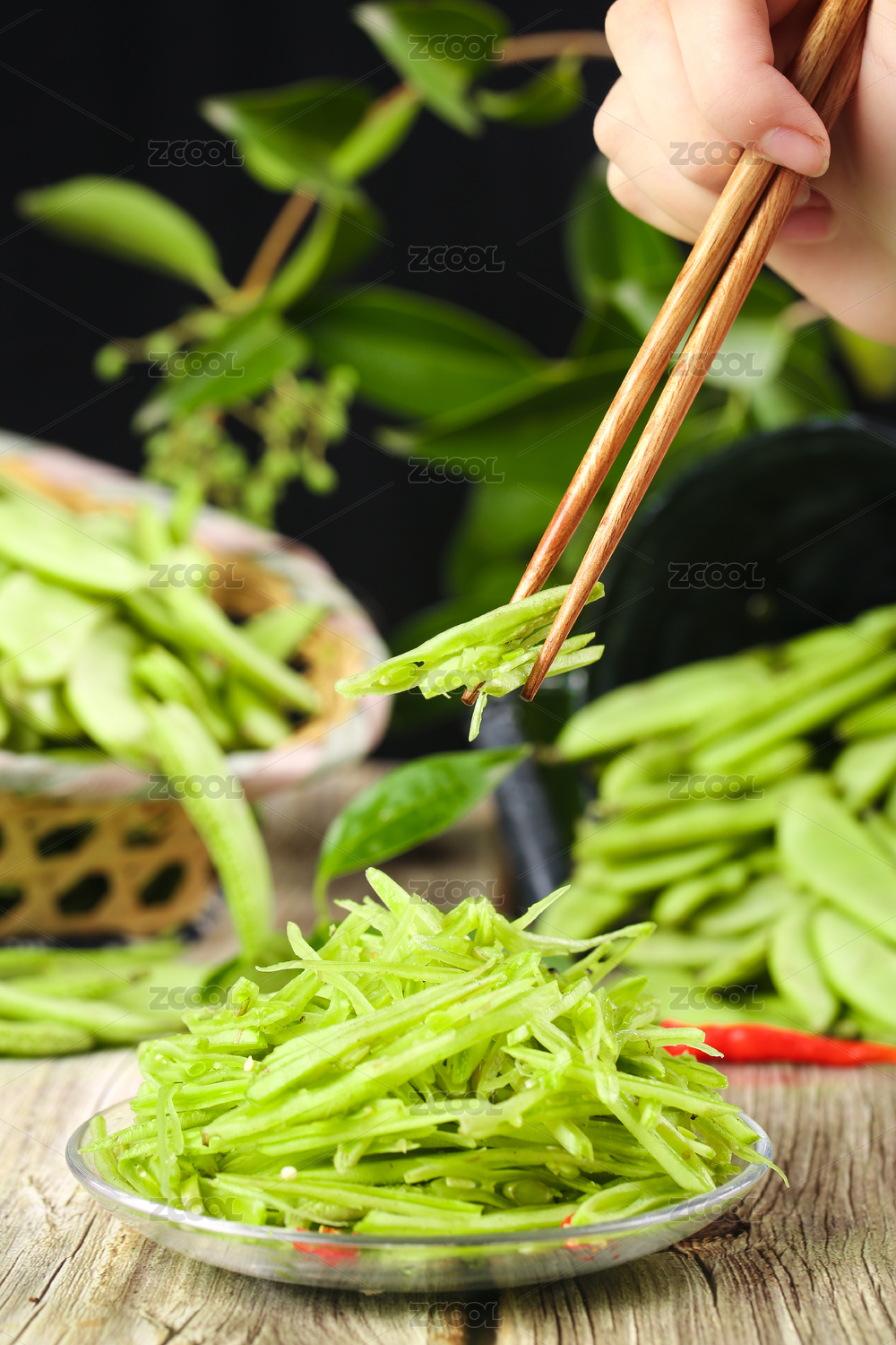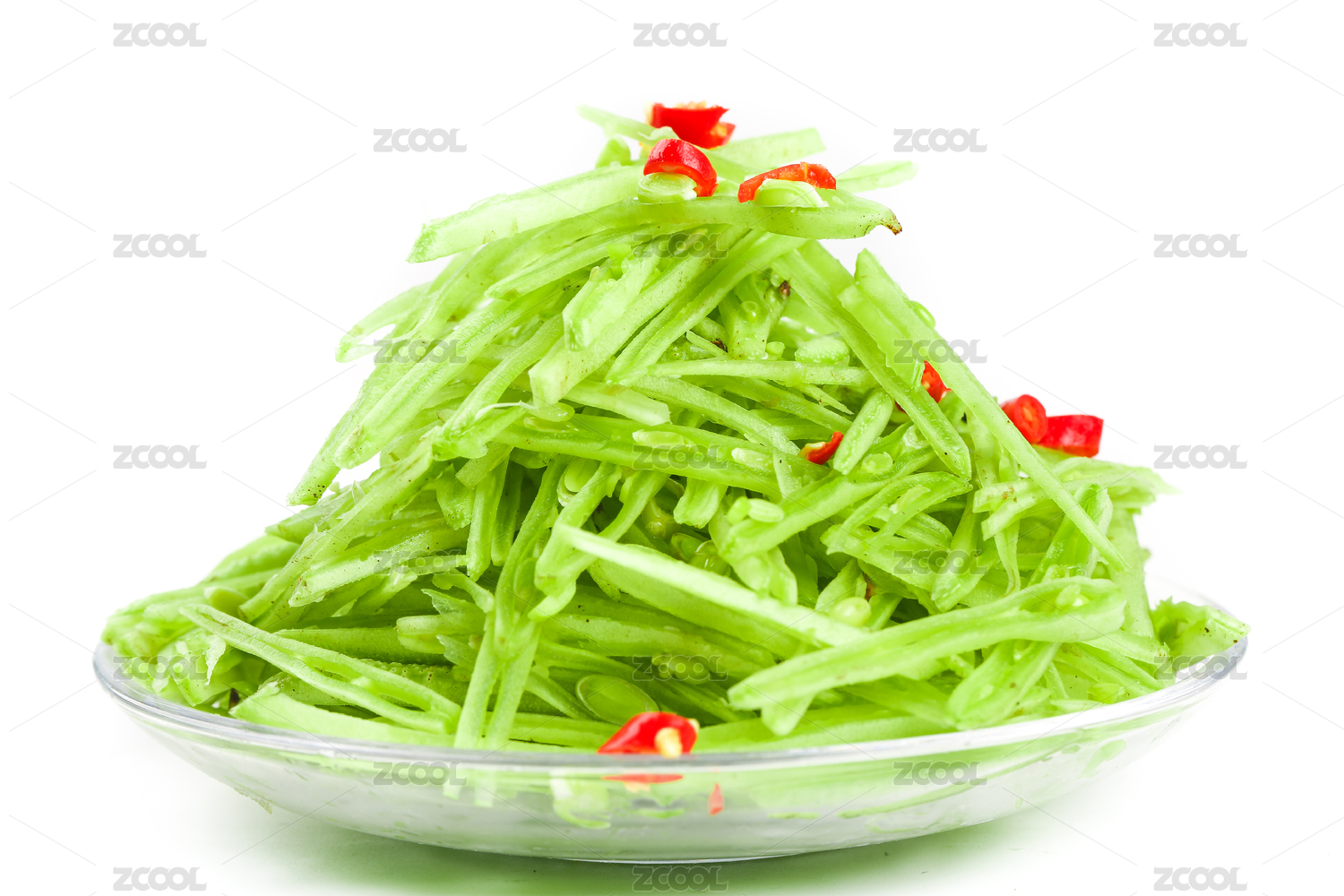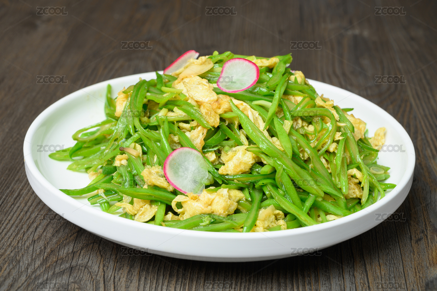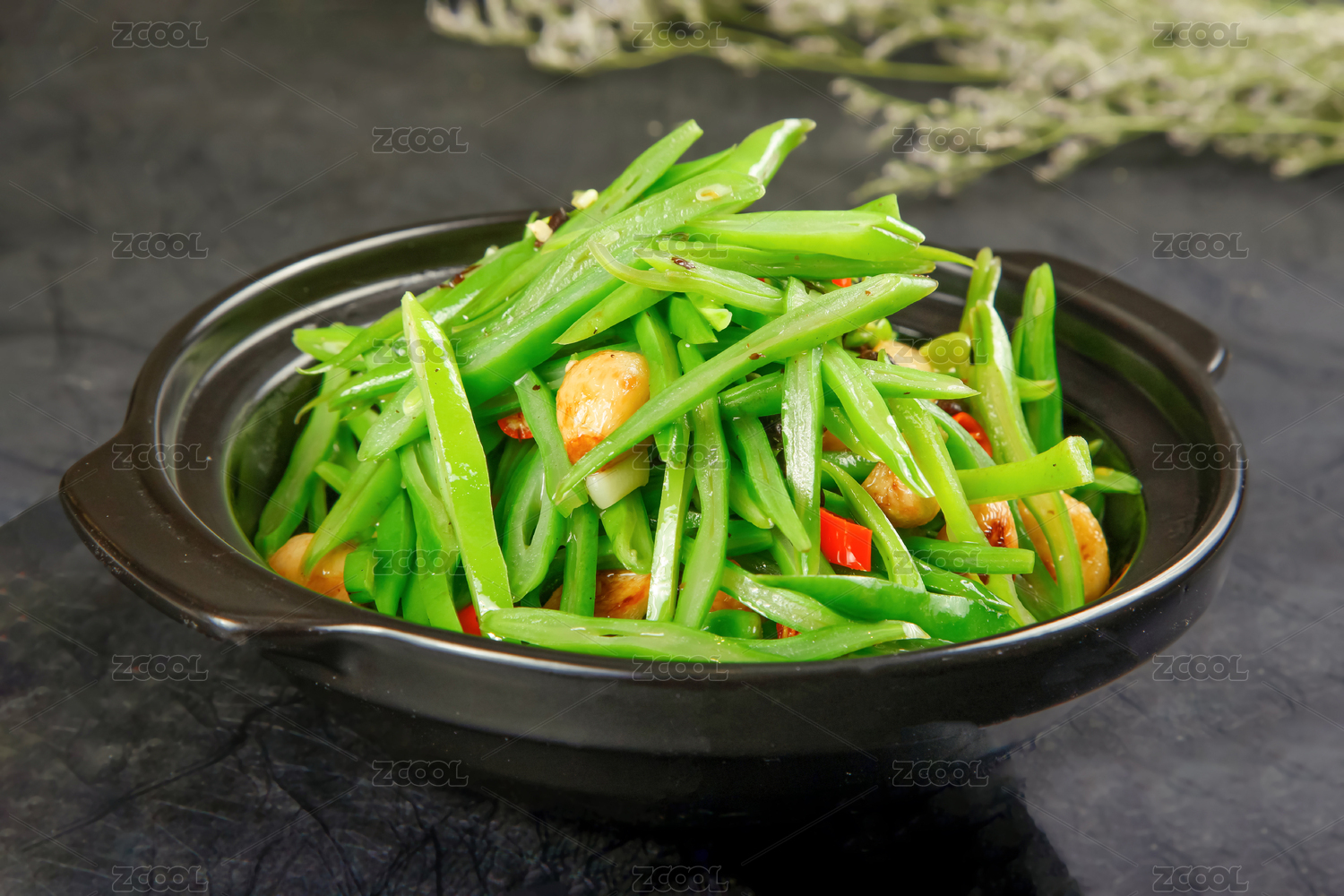 白色背景下的一盤香辣湖南菜,扁豆絲