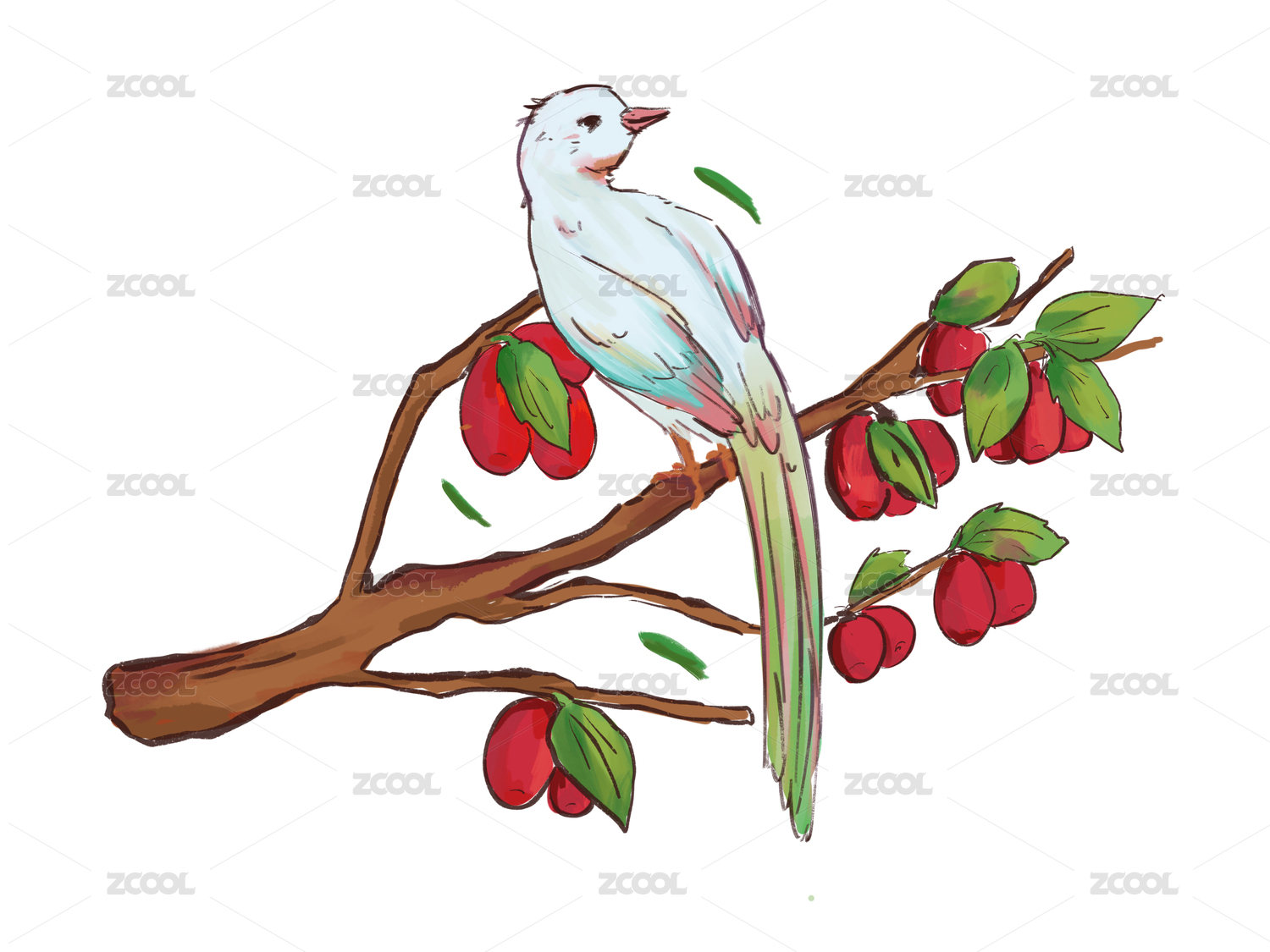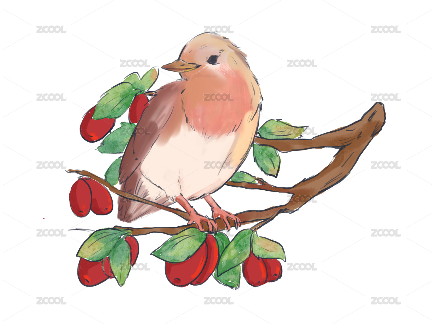 橘色寫實(shí)水彩鳥棗樹棗子組合元素