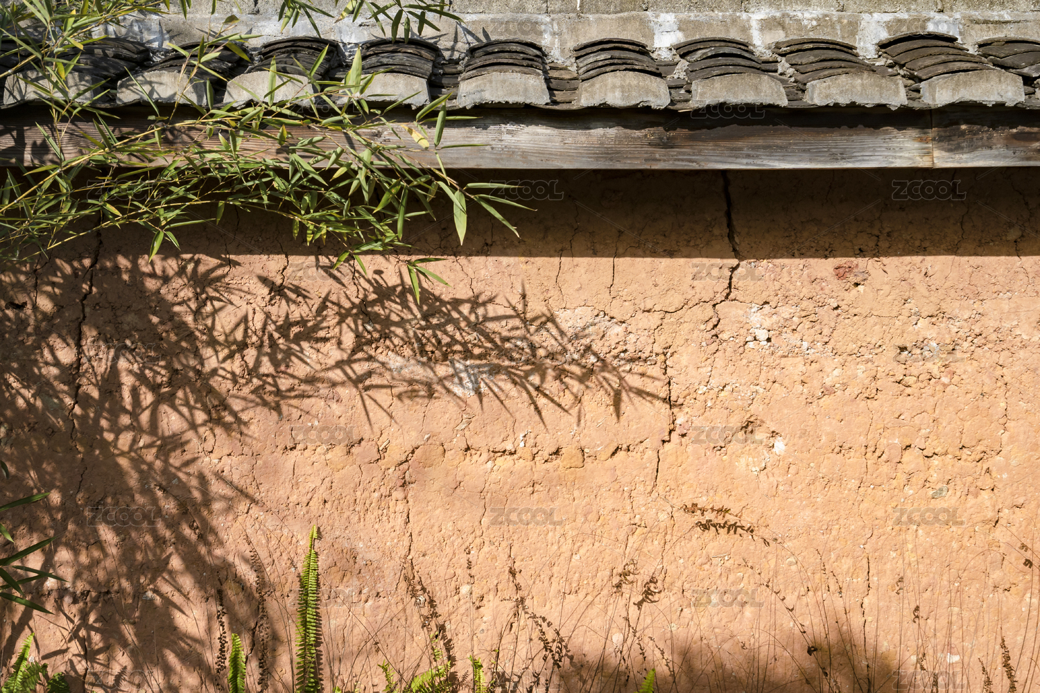 屋檐下的黃色泥土墻及投射在上面的竹影