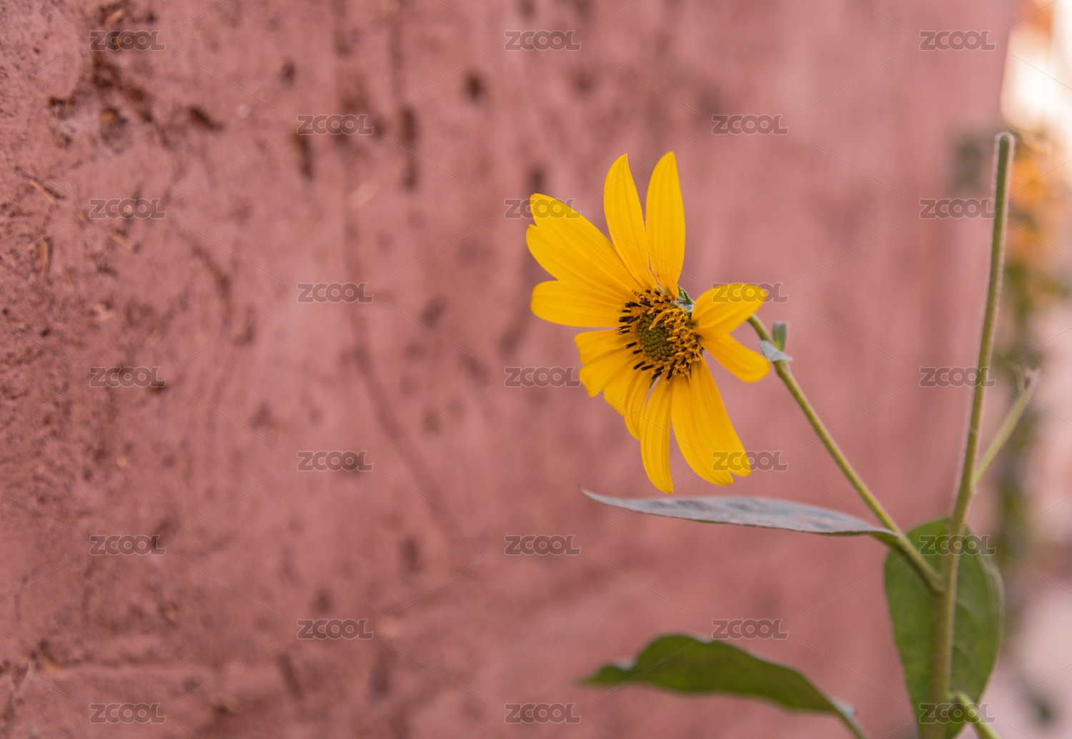 泥土墻做背景綠葉映襯下盛開的一朵黃色小花