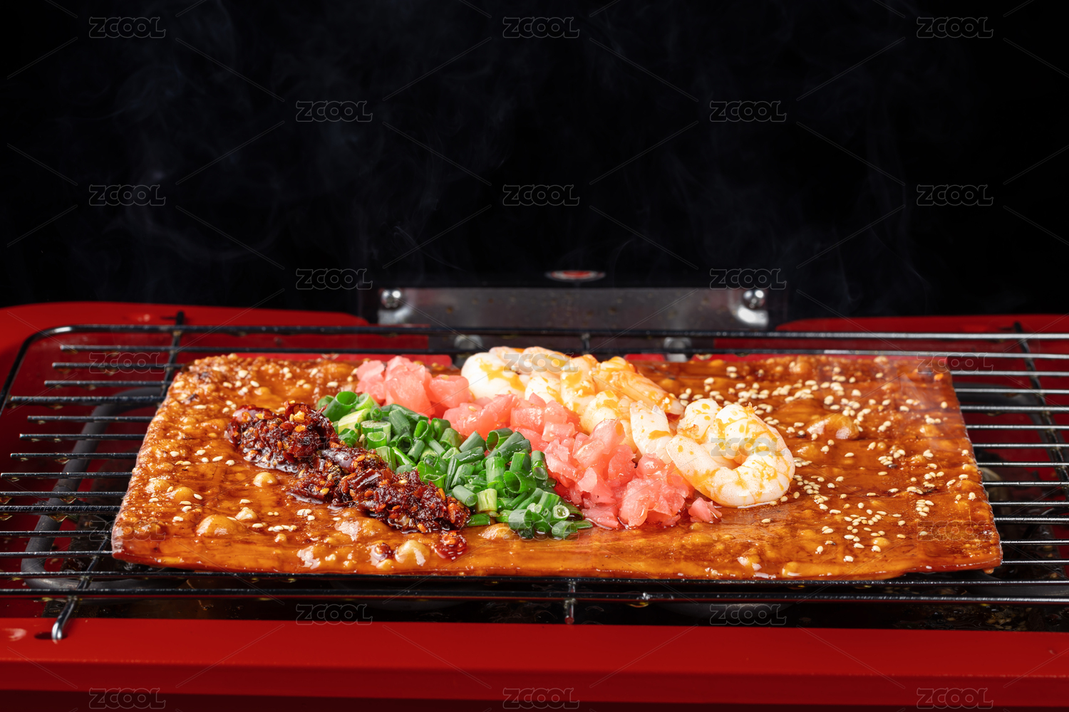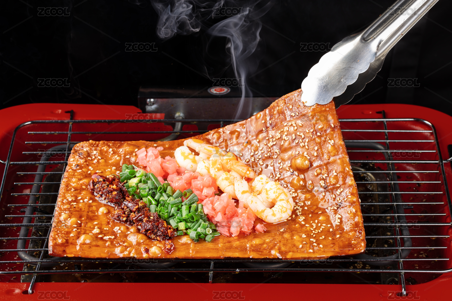 正在燒烤架上烤的重慶小吃烤豆干卷蝦仁