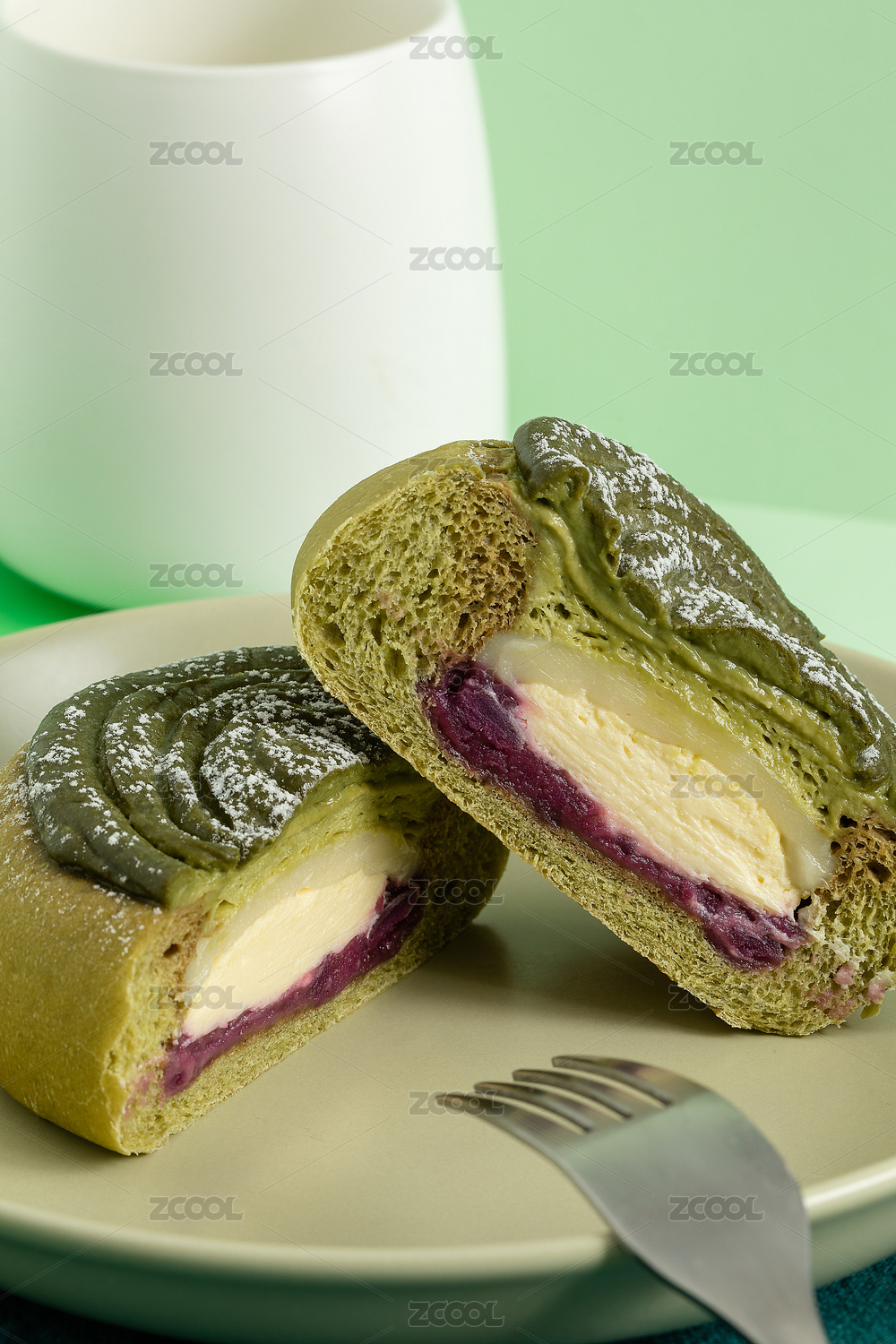 綠色背景中的芋泥麻薯抹茶軟歐包