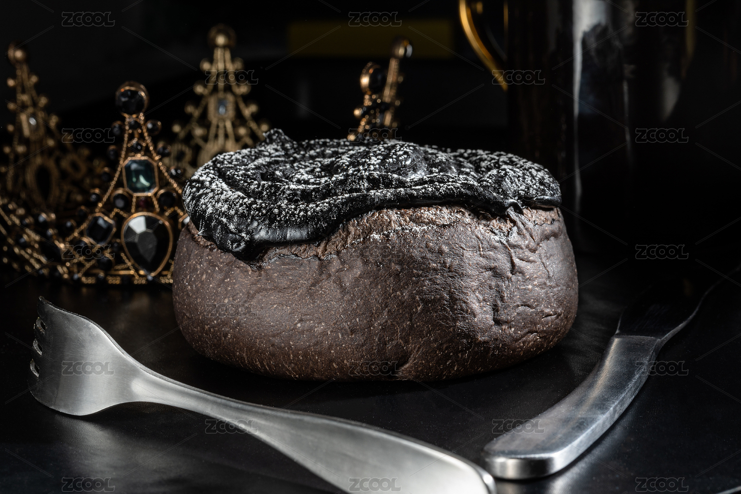 黑色背景中的黑色蛋黃麻薯軟歐包