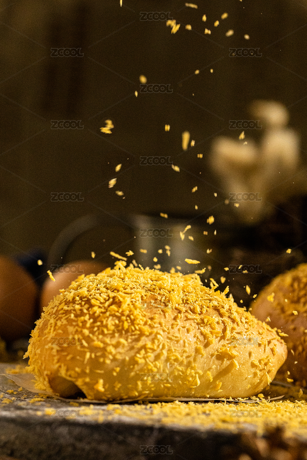 深色背景中面包屑散落在軟歐包上