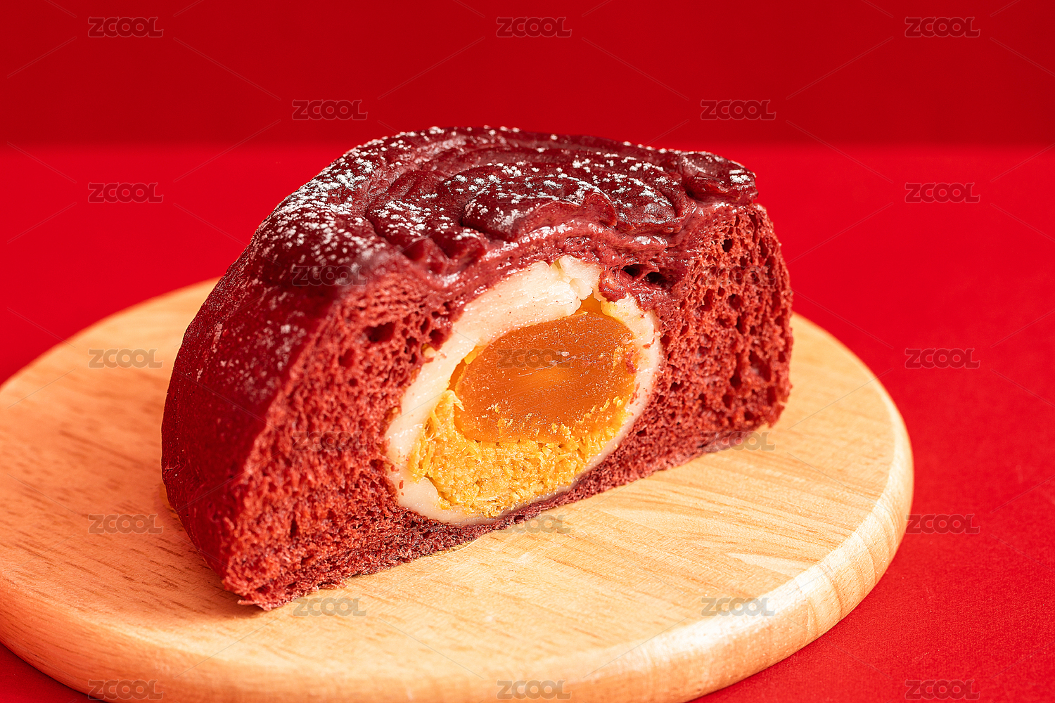 紅色背景中的咸蛋黃軟歐包餡料切面