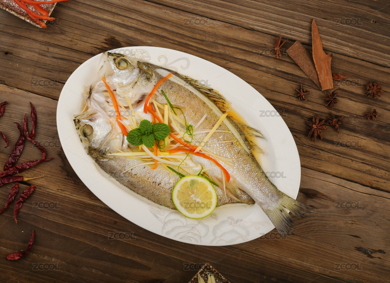 木紋桌子上的清蒸鱸魚