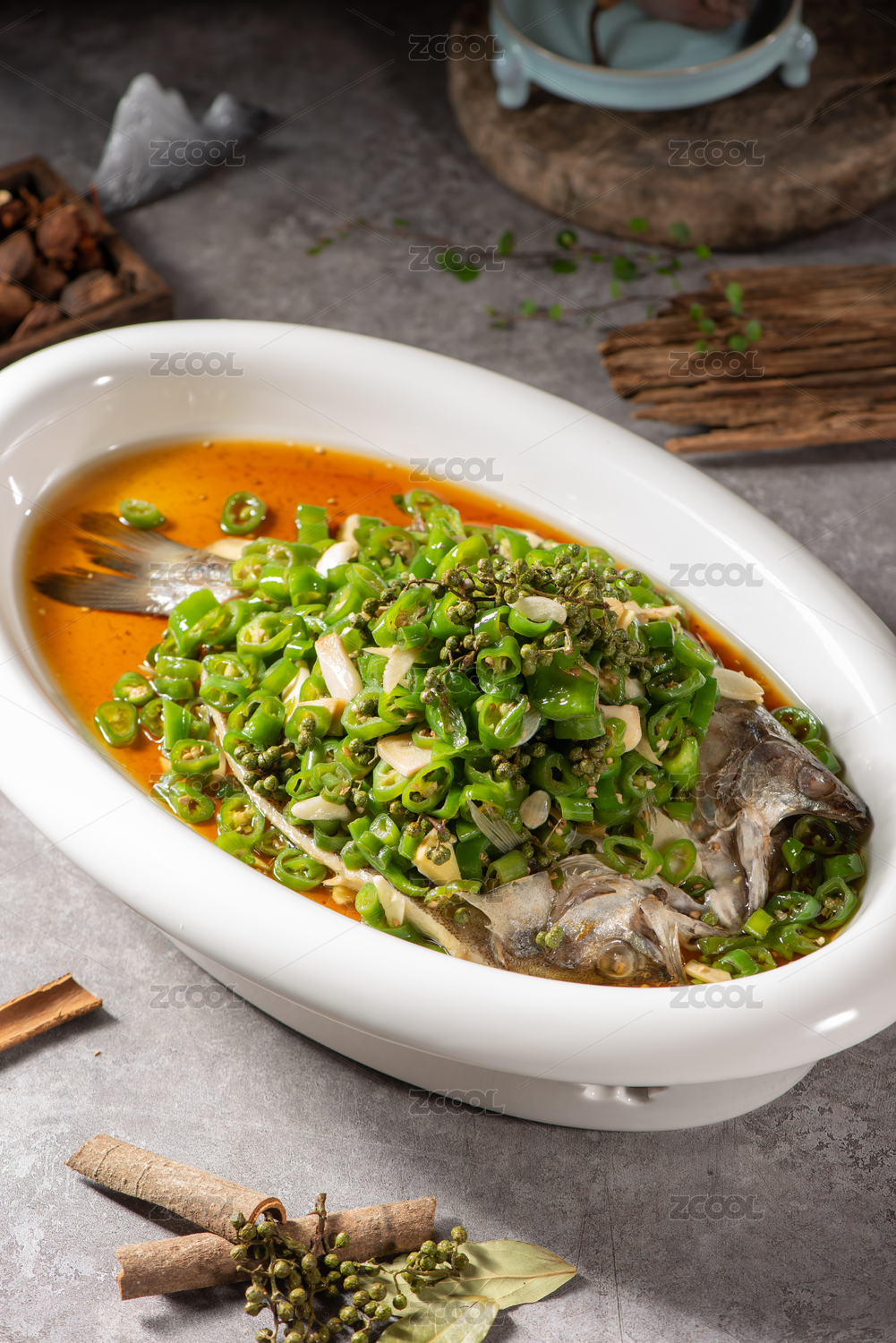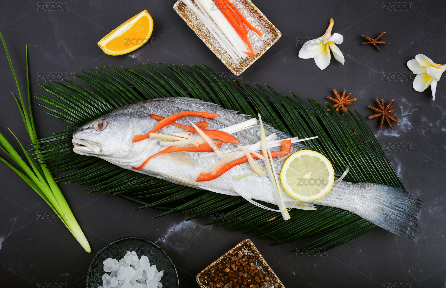 新鮮干凈的鱸魚搭配番茄、大蒜、花椒、八角擺放在木砧板上
