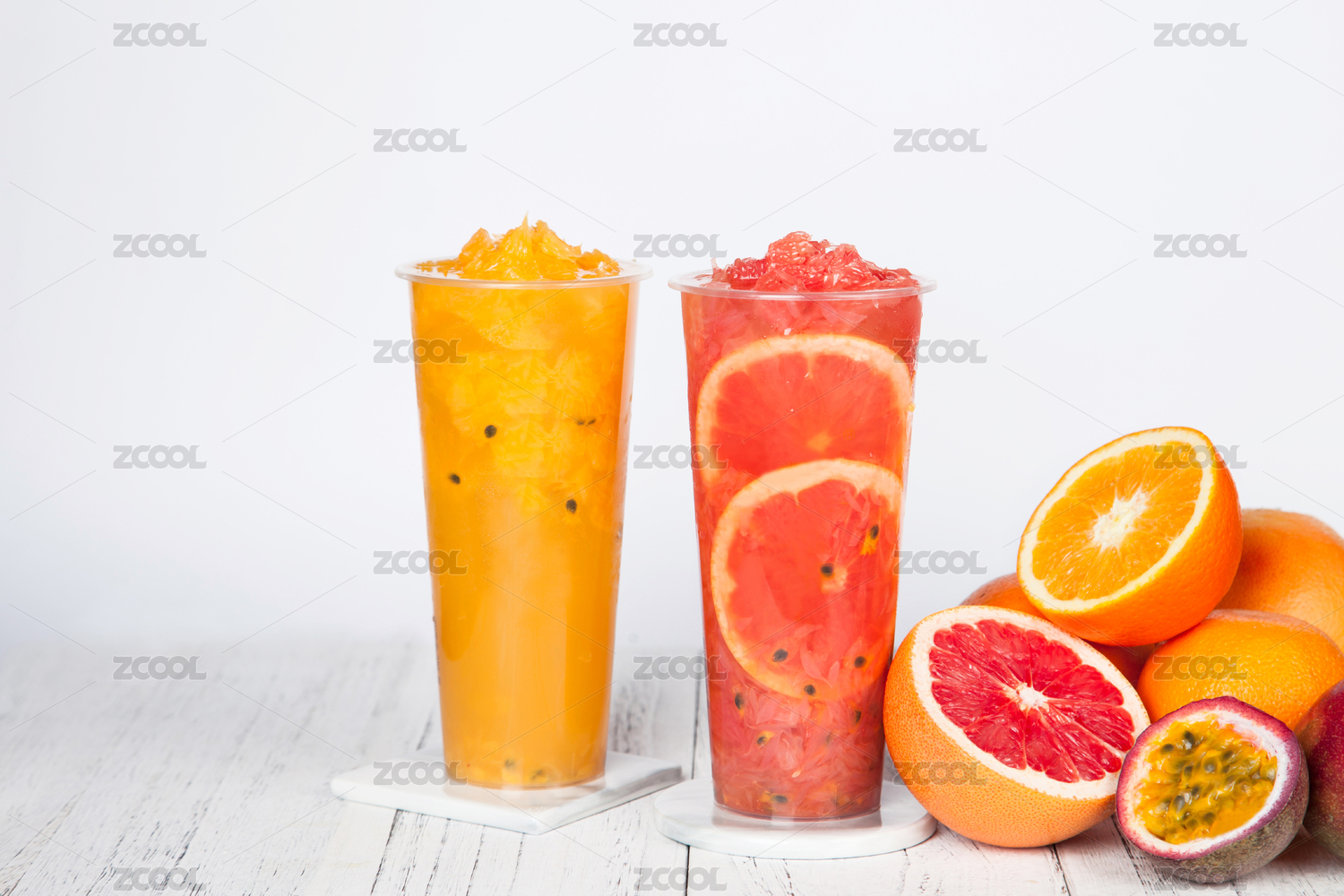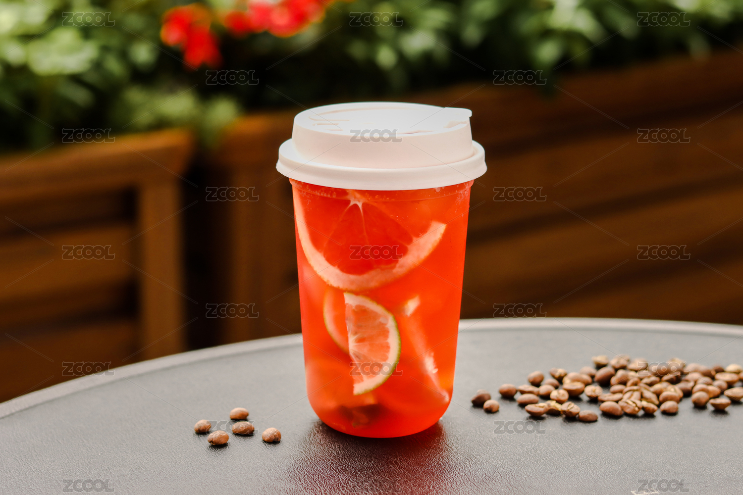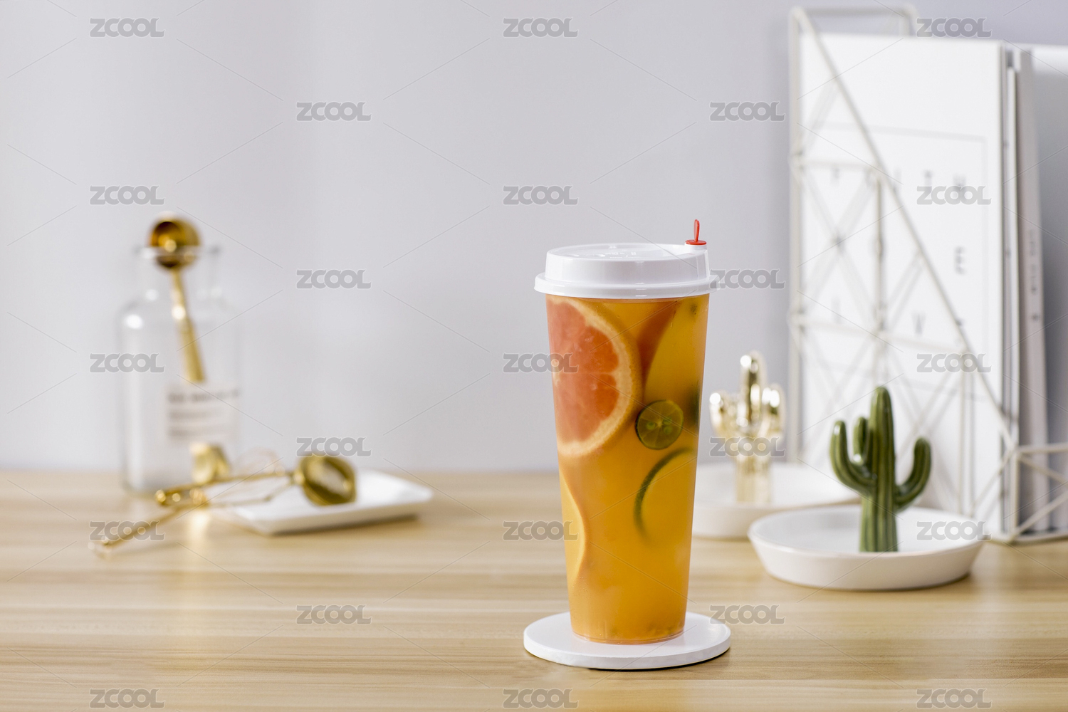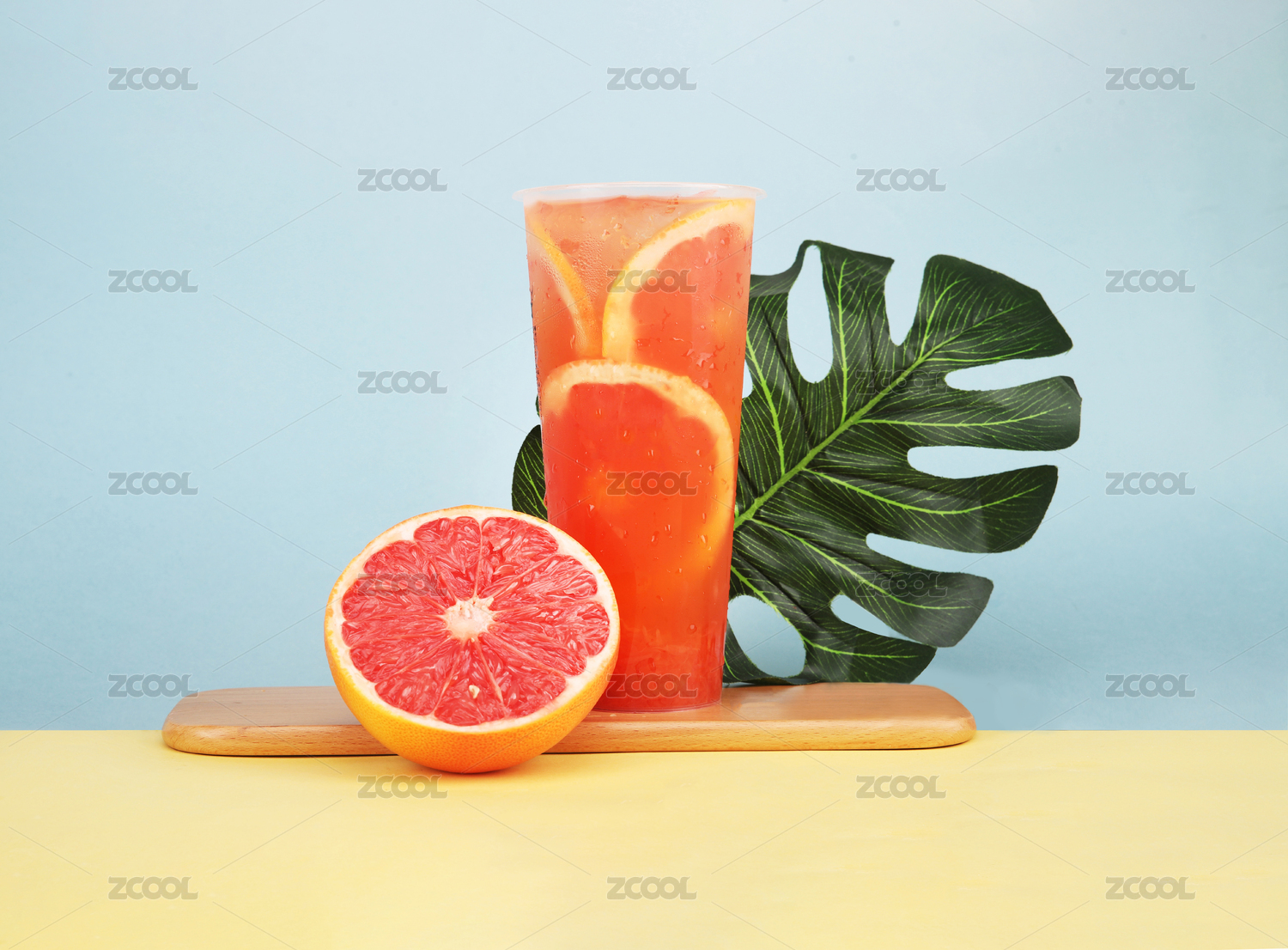 放在粉紅色桌上的橙紅色西柚茶水果茶飲料