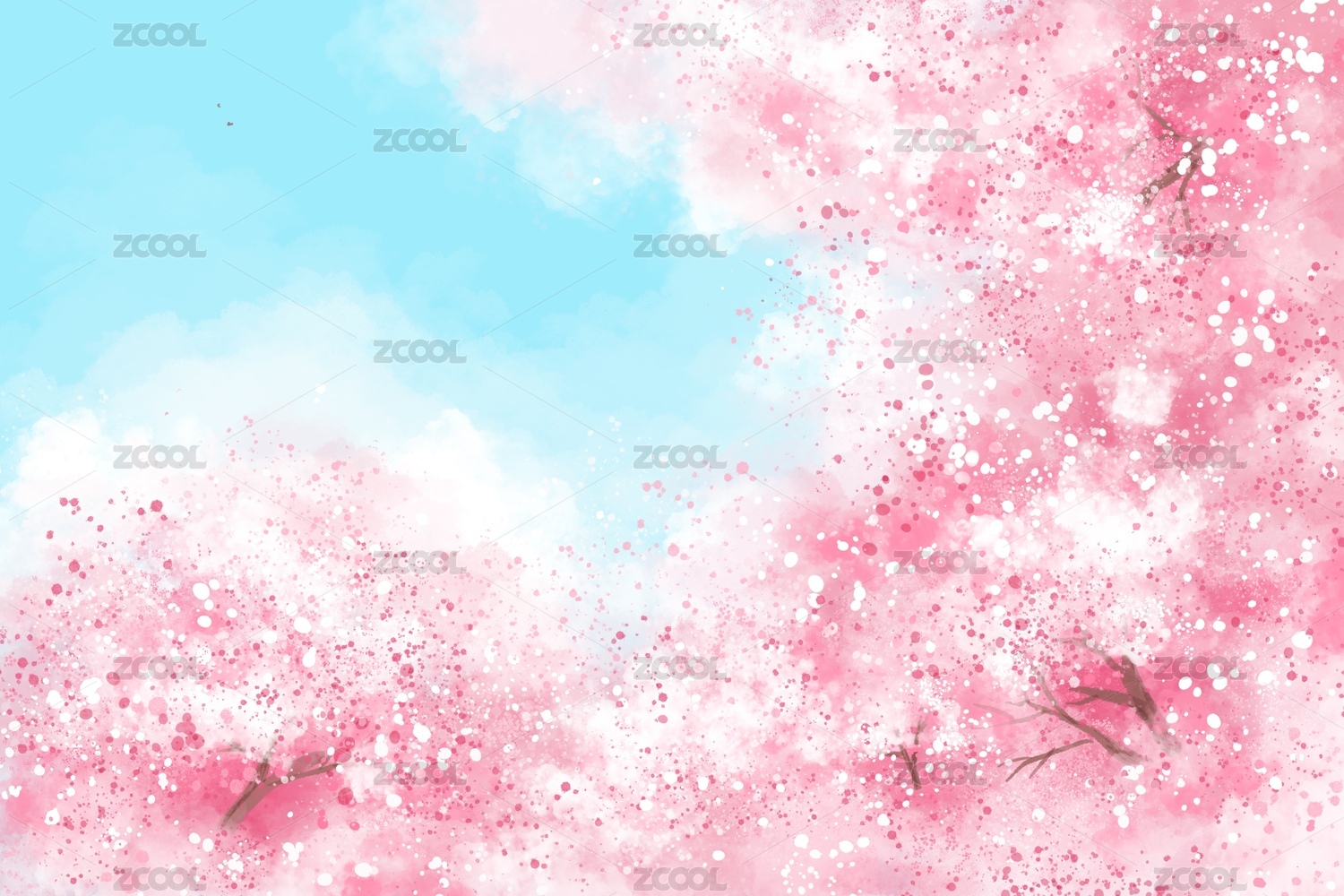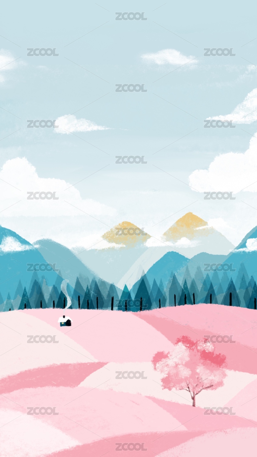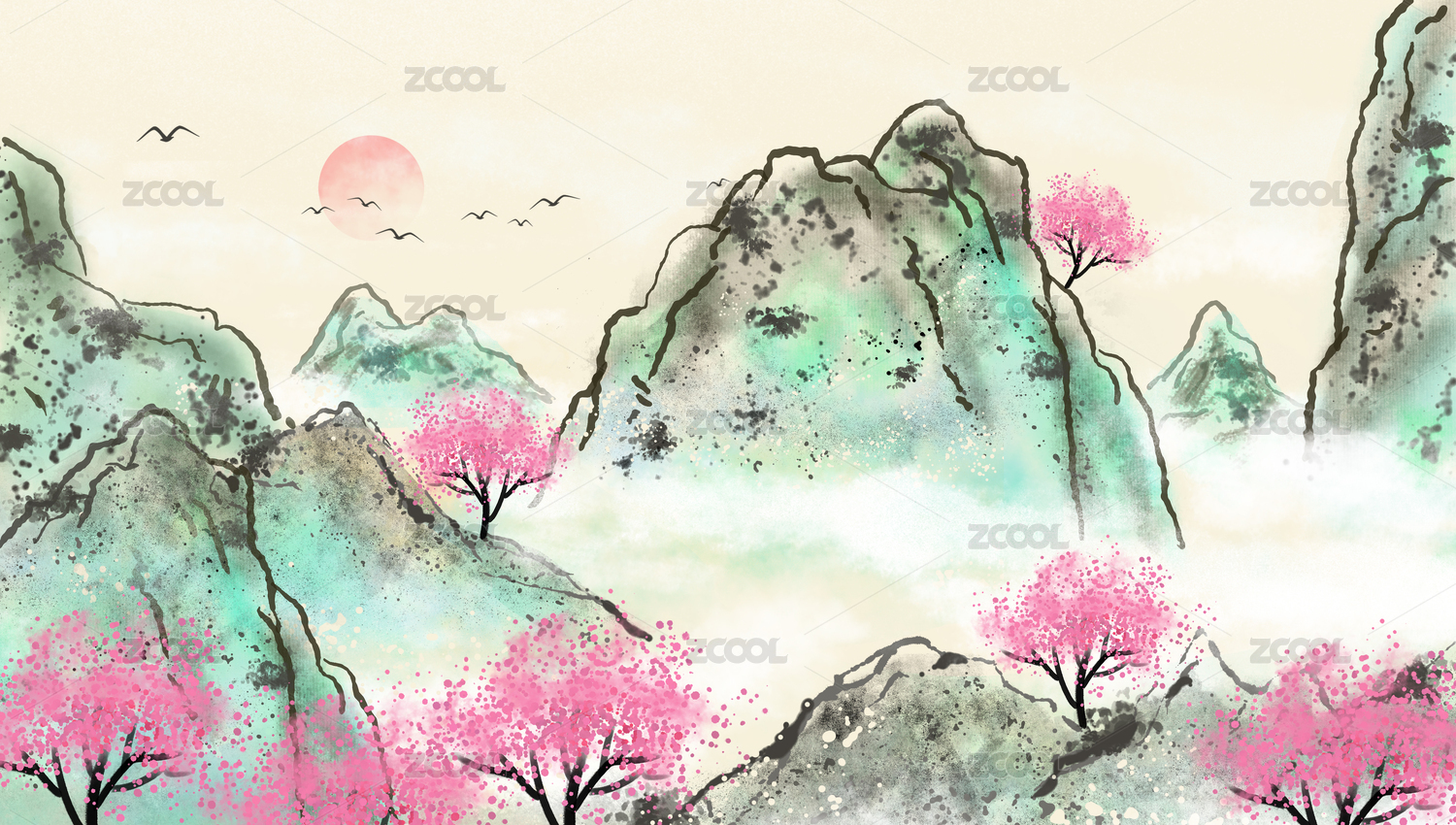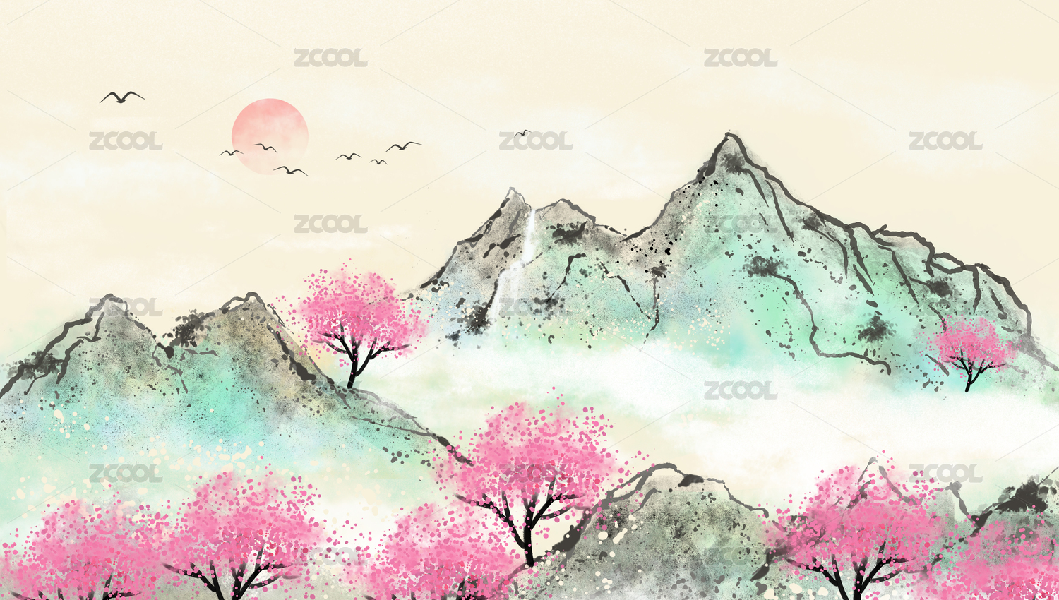 中國(guó)傳統(tǒng)中國(guó)風(fēng)抽象山林櫻樹(shù)詩(shī)意水墨畫