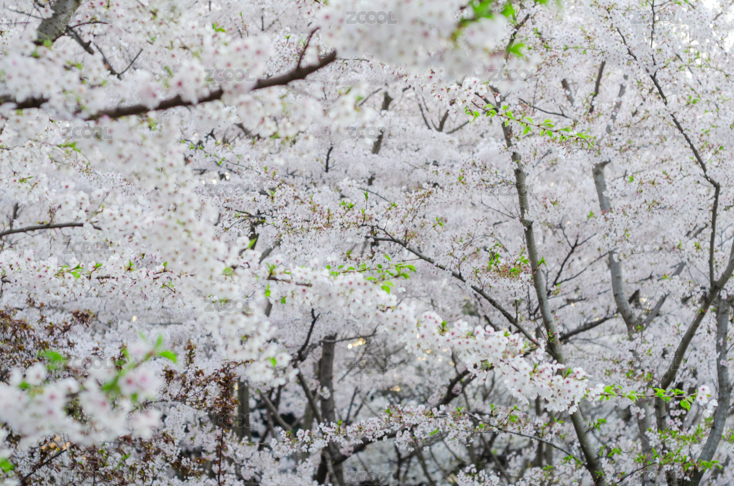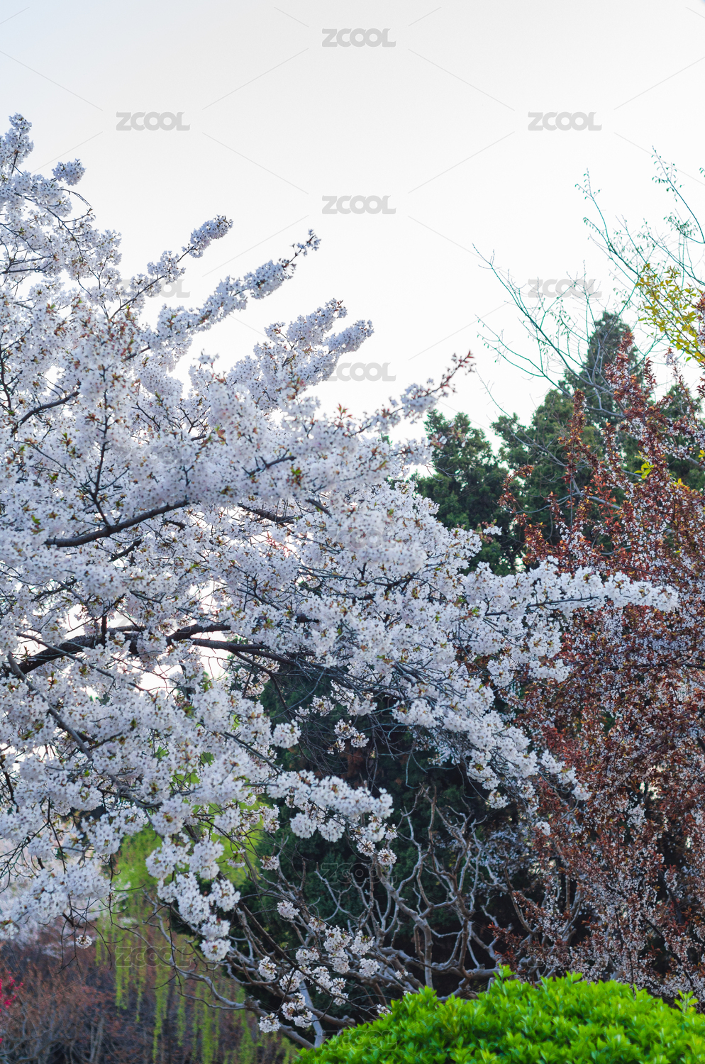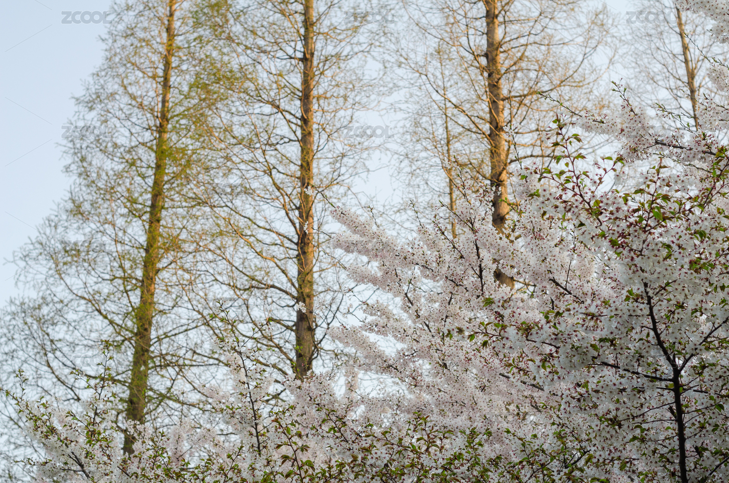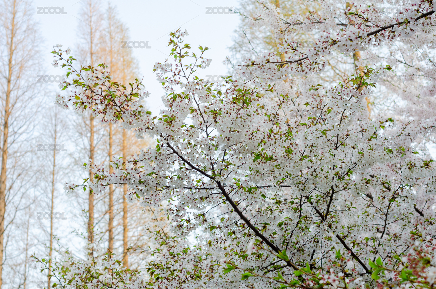 春天公園中雪白的的櫻花盛開(kāi),后邊一排大樹(shù)