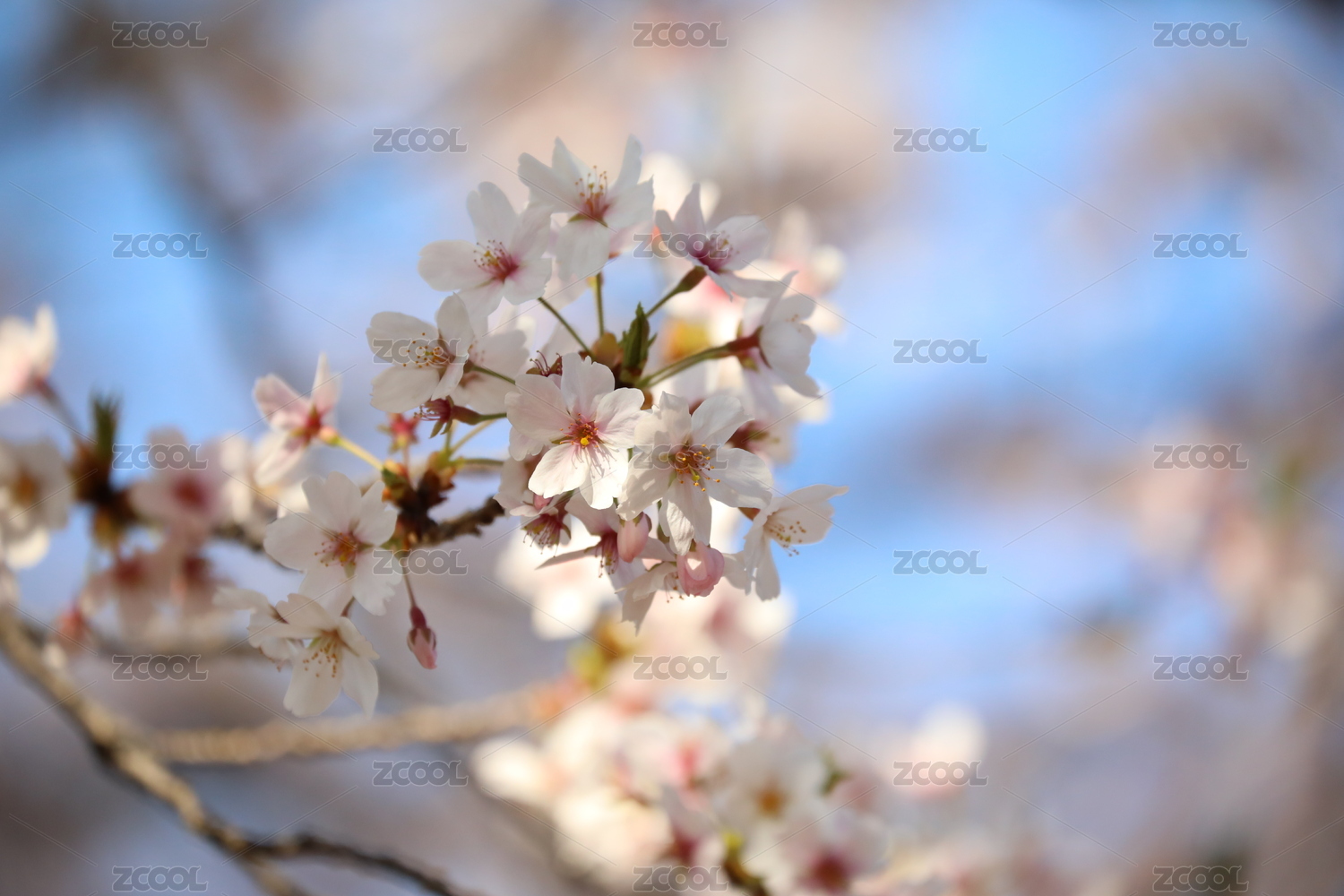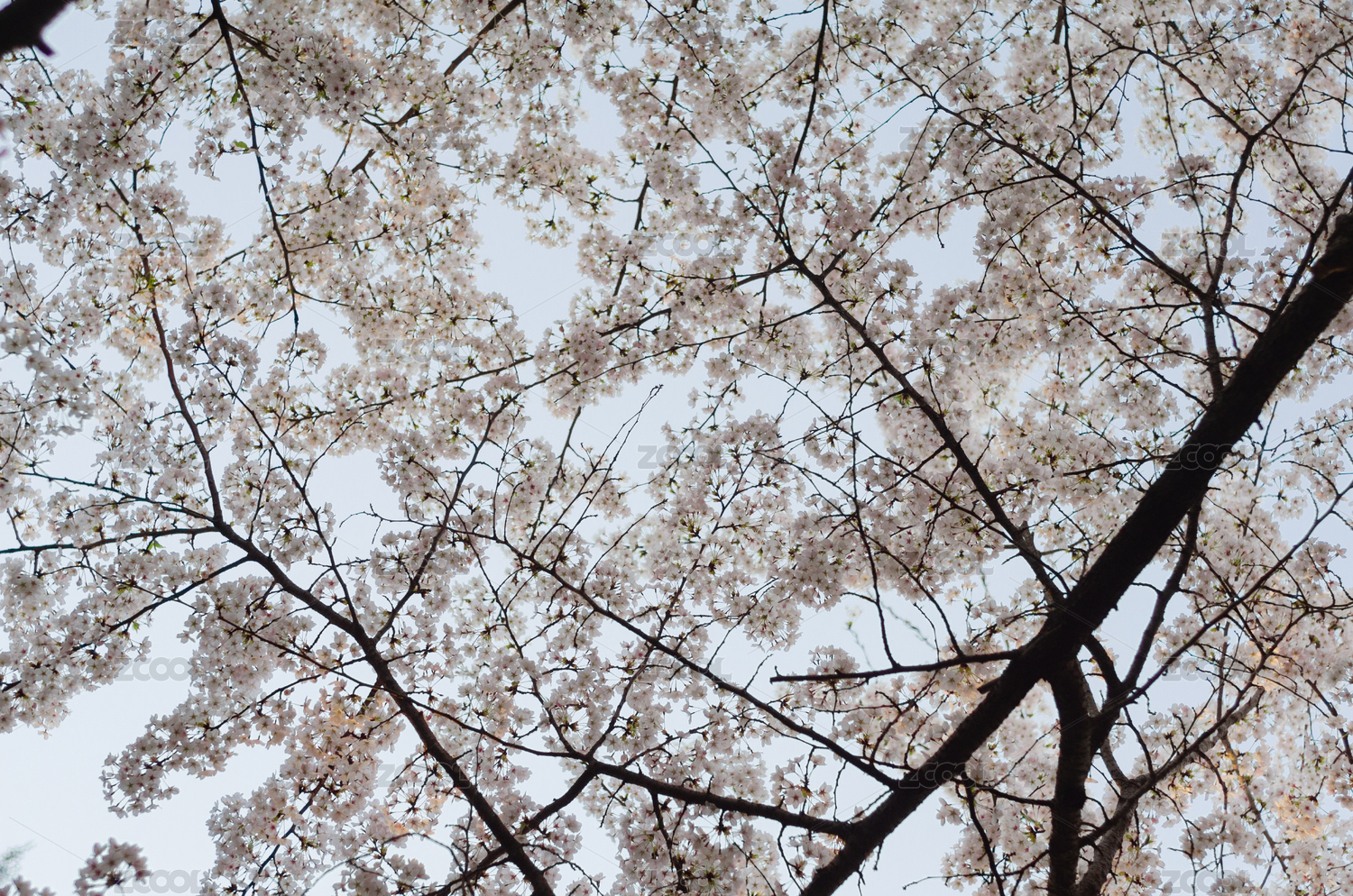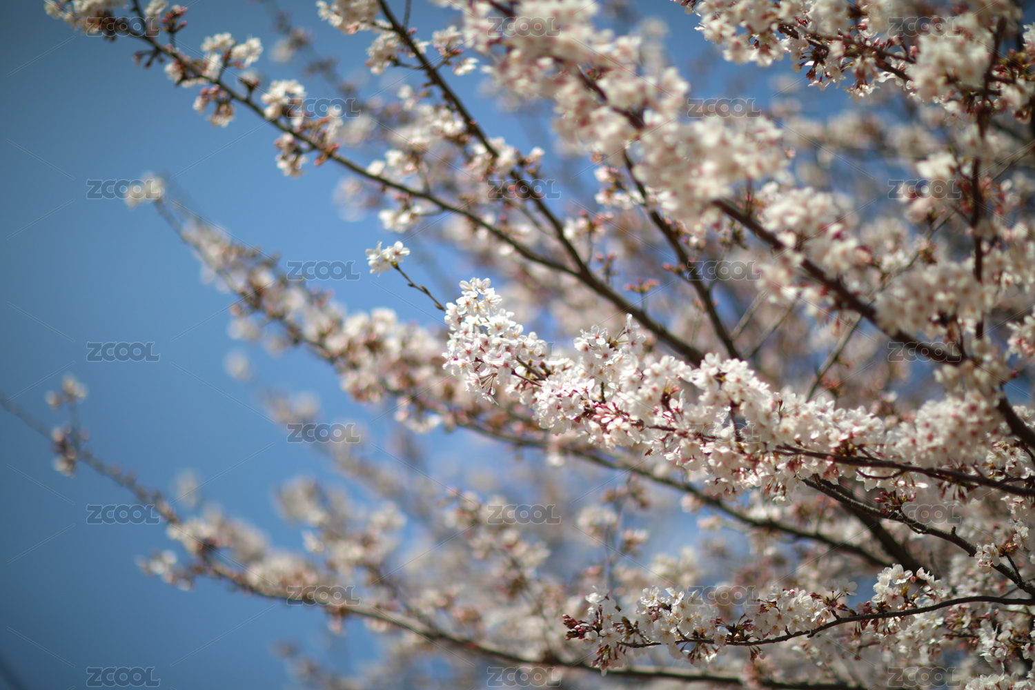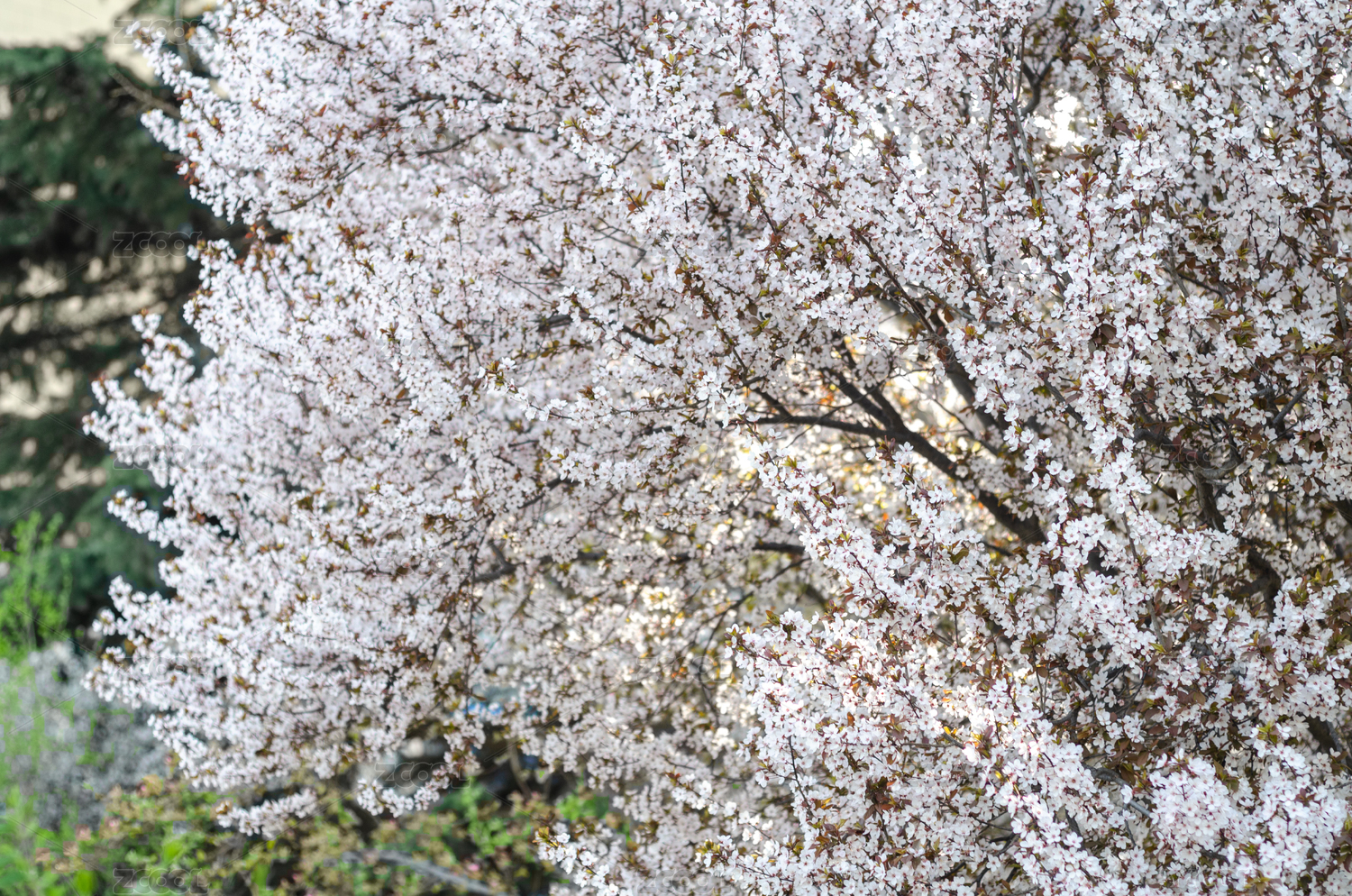 春天公園中雪白的的櫻花盛開(kāi),后邊一排大樹(shù)