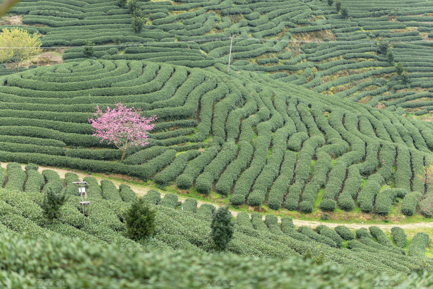 綠色茶園中一棵開(kāi)花的粉色吉野櫻樹(shù),中國(guó)福建漳平永福