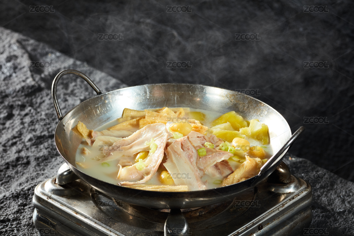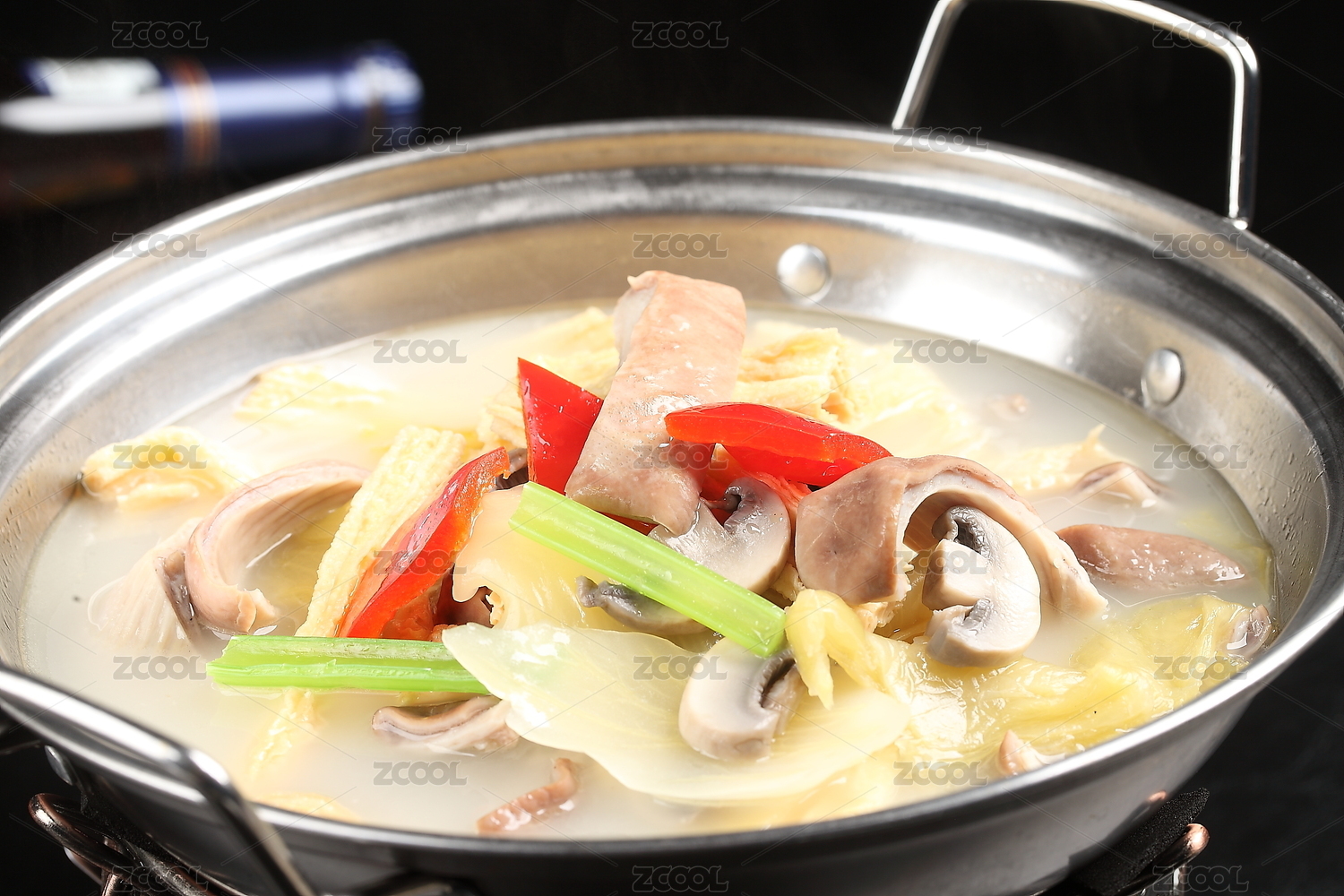 中國上海的一道熱菜——鍋仔咸菜豬肚 鍋仔 咸菜豬肚 豬肚湯 豬肚 肚片 白切豬肚 芹菜 筍干 紅辣椒 蘑菇 菌菇 香菇 泡菜 酸菜 銅鍋 鍋 餐具 靜物 美食 食物 炒鍋 火鍋 烹飪 膳食 食譜 炊具和烤盤