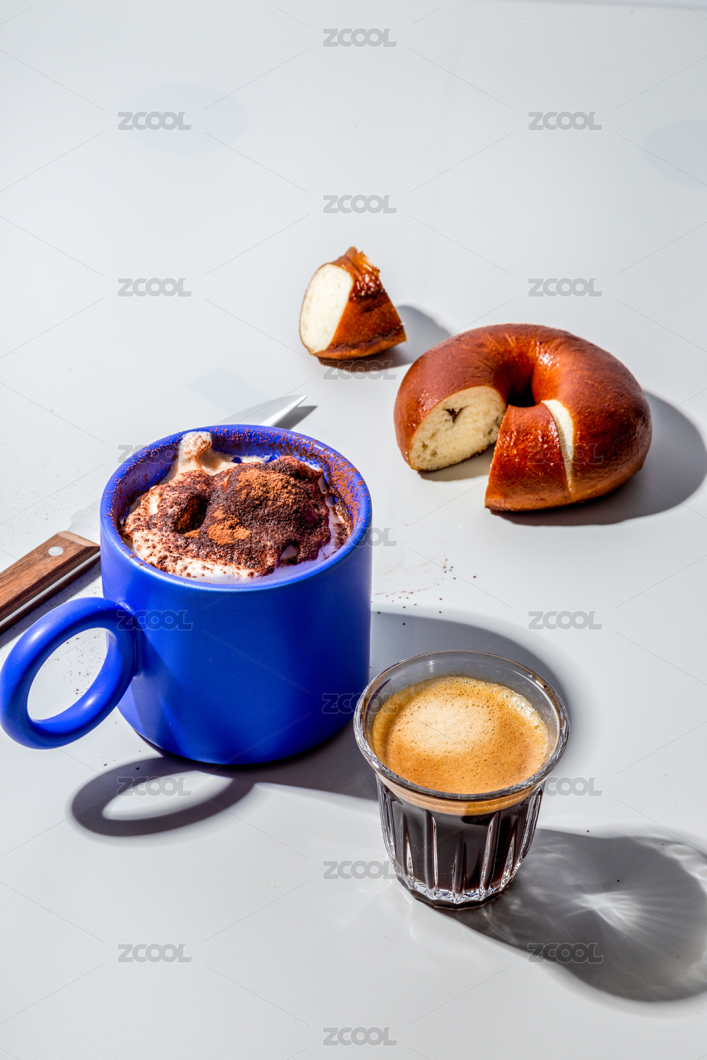 灰色桌面上有一杯巧克力拿鐵和一塊堿水面包