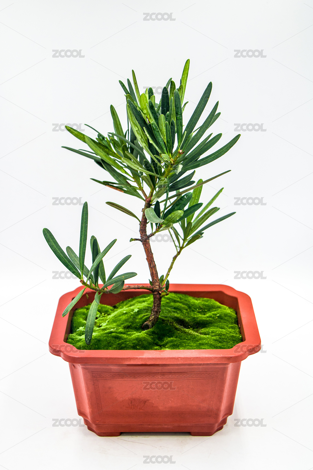 綠色背景雀舌羅漢松盆景新芽特寫(xiě)