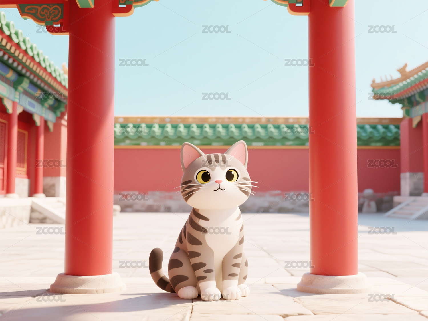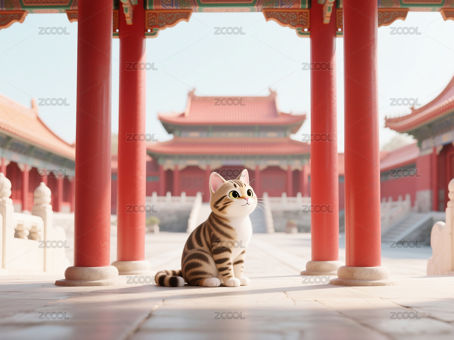 3D故宮里朱漆檐柱下的貍花貓插畫