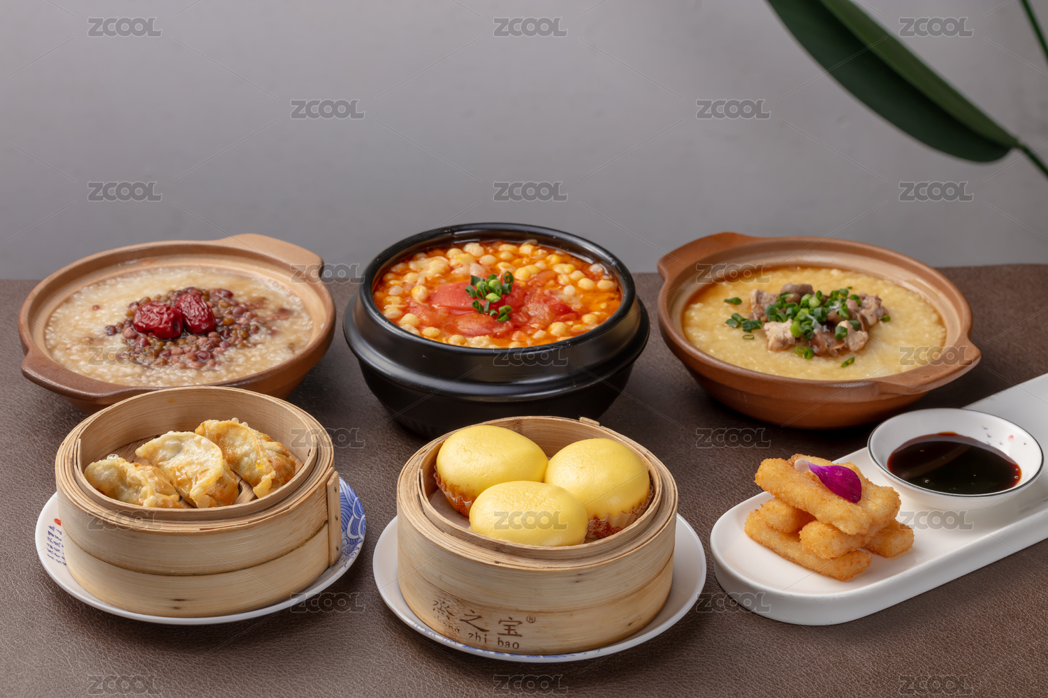 桌上紅糖糍粑條流沙包小吃點心配養(yǎng)身粥