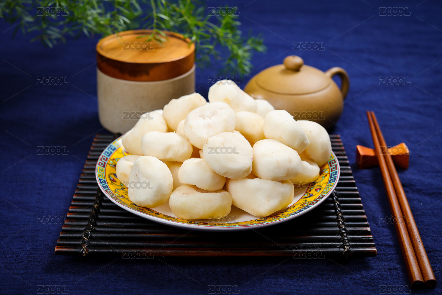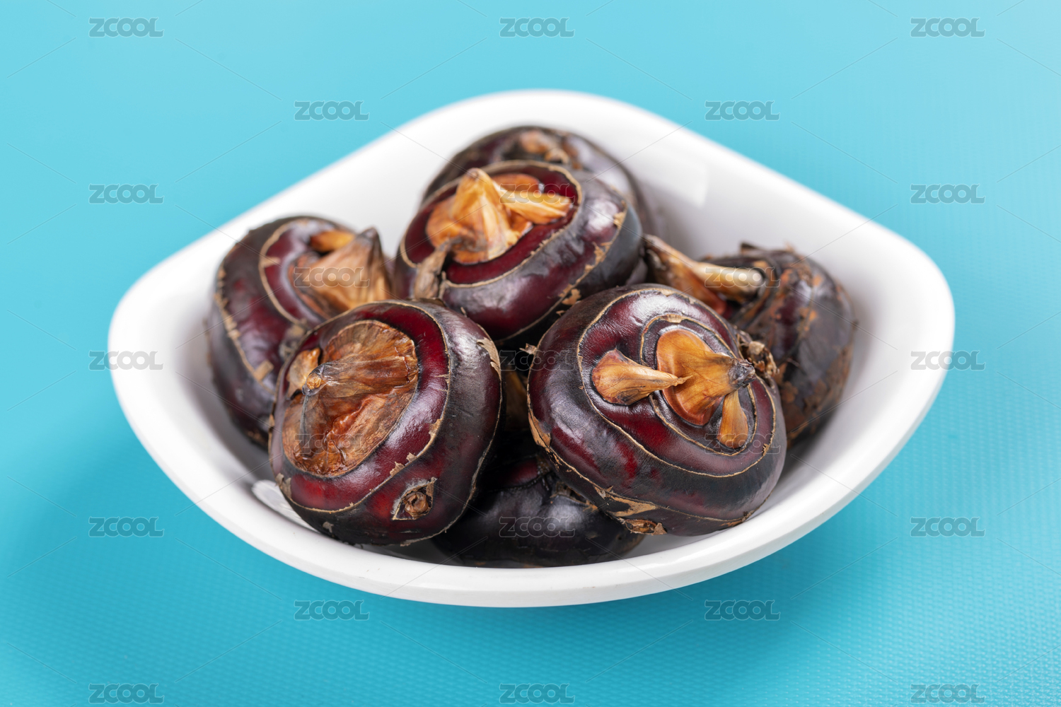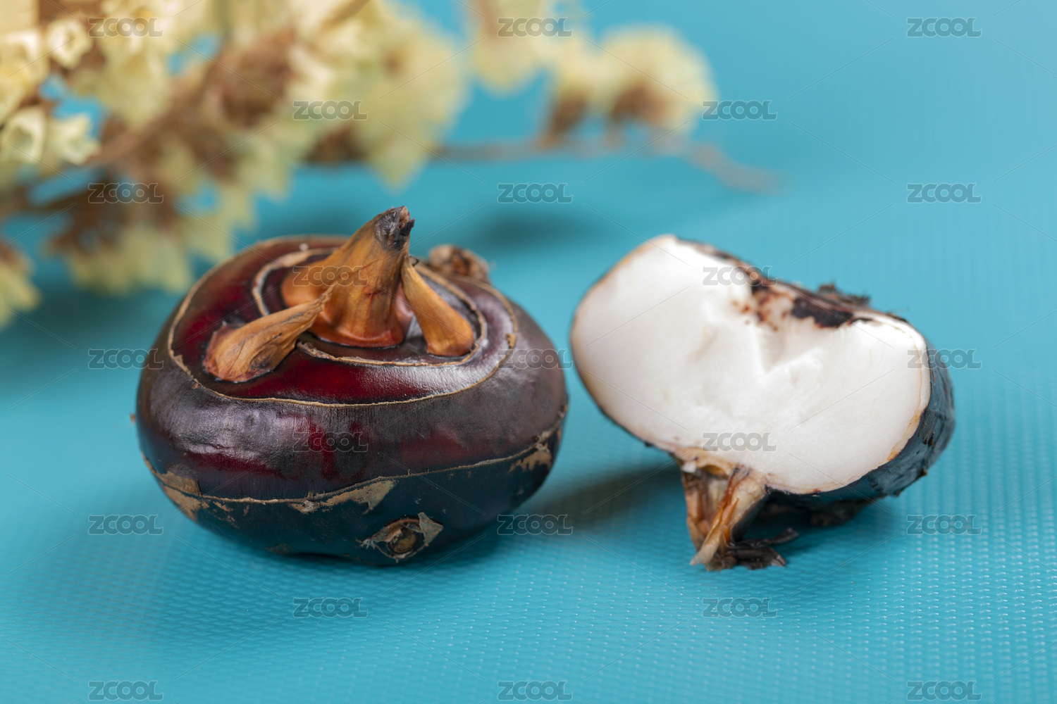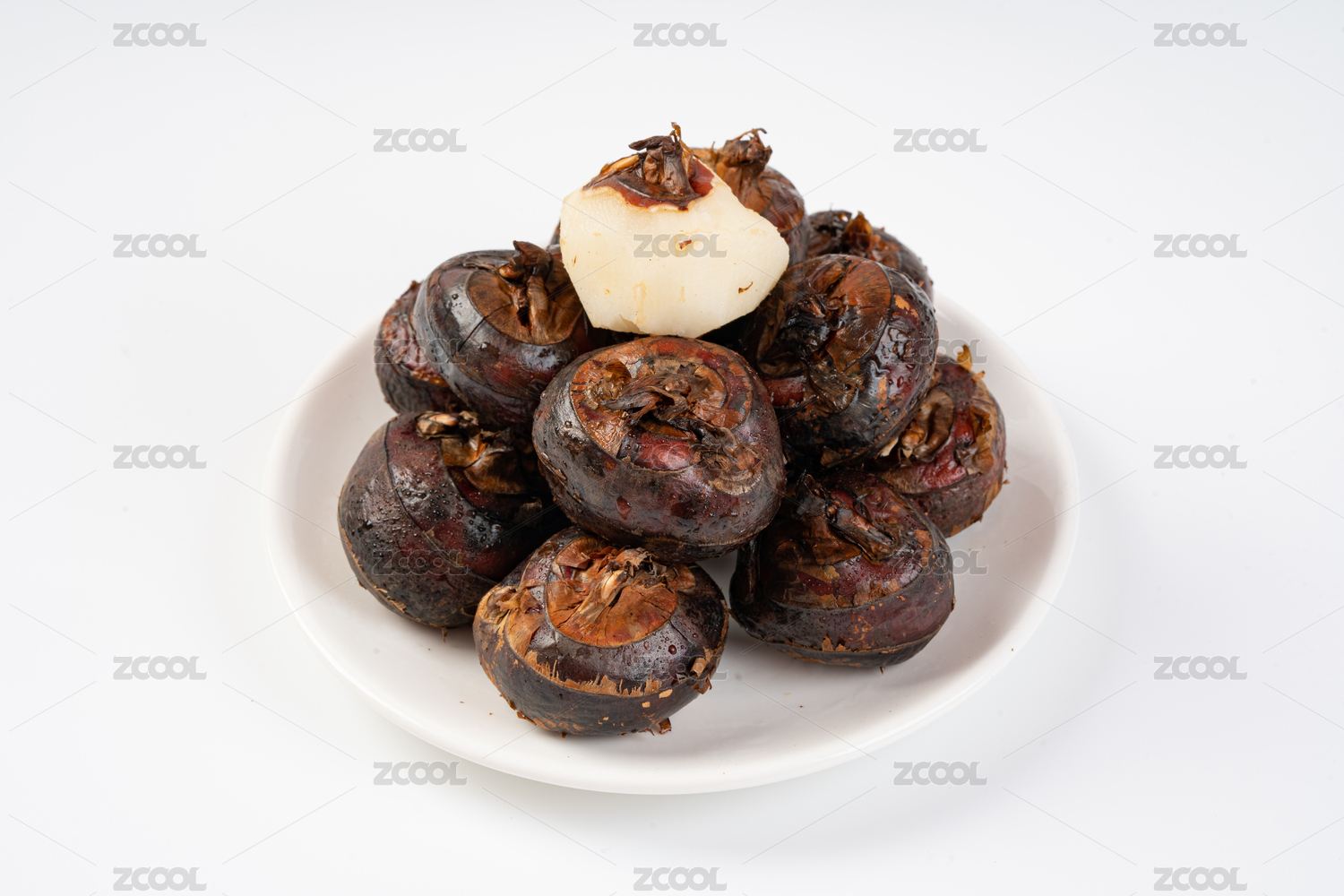 白底上放著一個(gè)完整的馬蹄和削皮的荸薺
