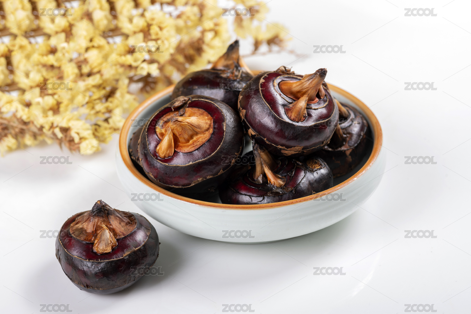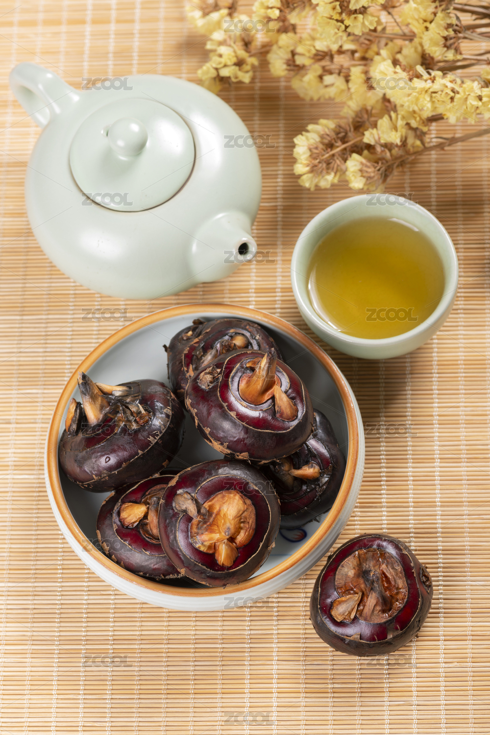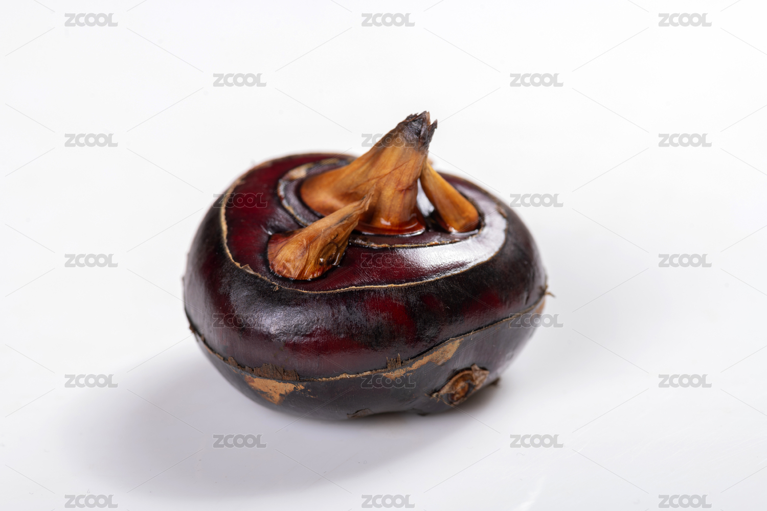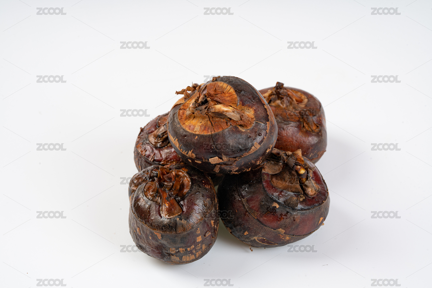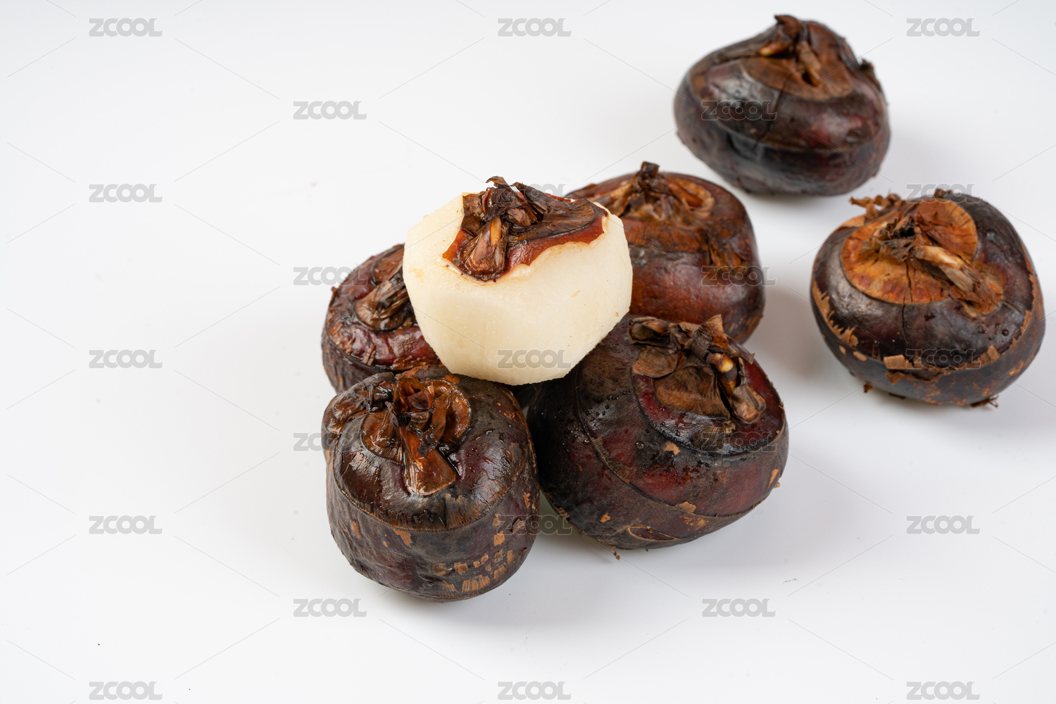白底上放著一個(gè)完整的馬蹄和削皮的荸薺