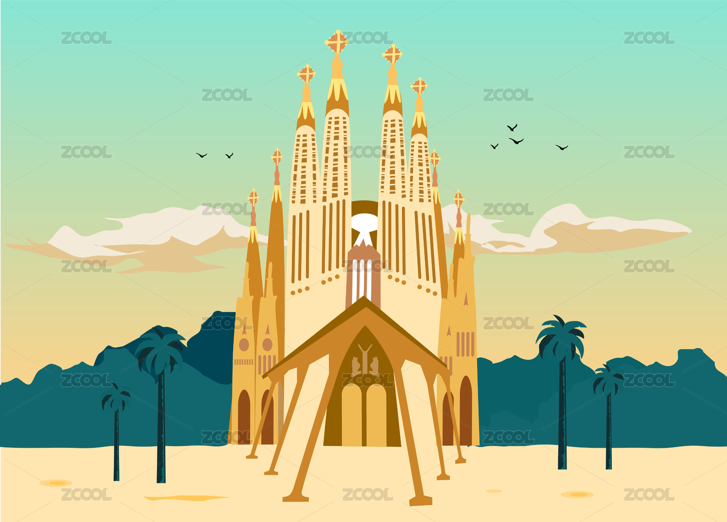 剪紙風(fēng)格西班牙國(guó)家地標(biāo)建筑巴塞羅納圣家族大教堂插畫