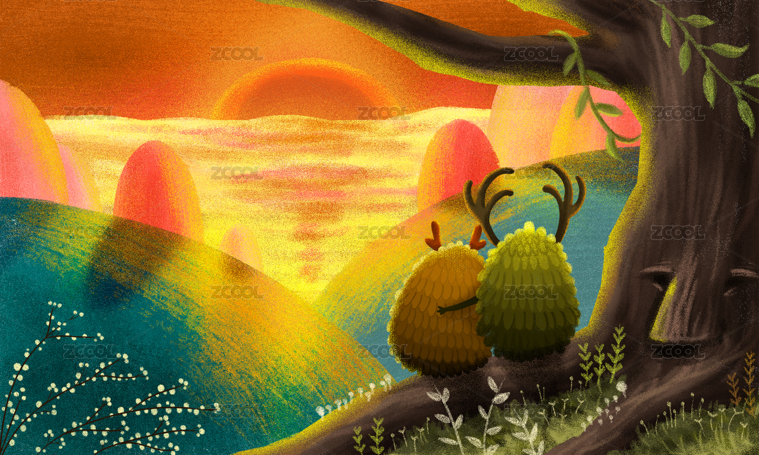 在山上的夕陽中相依偎看云海場(chǎng)景