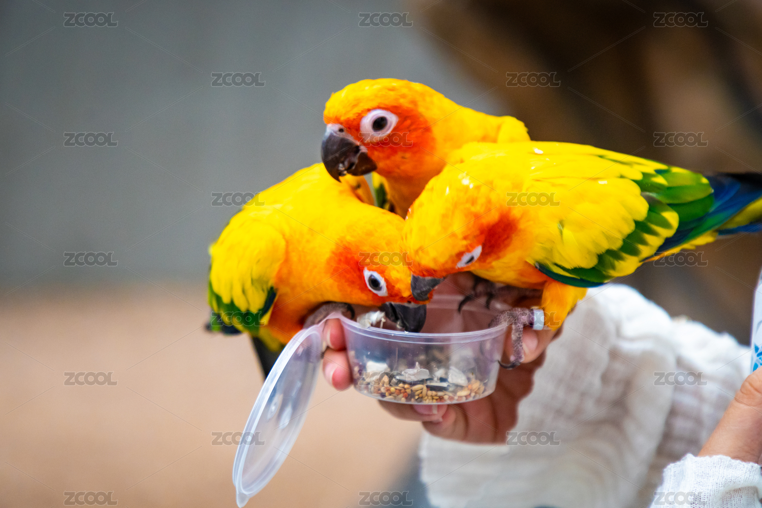 飼養(yǎng)員給美麗可愛的鸚鵡喂食