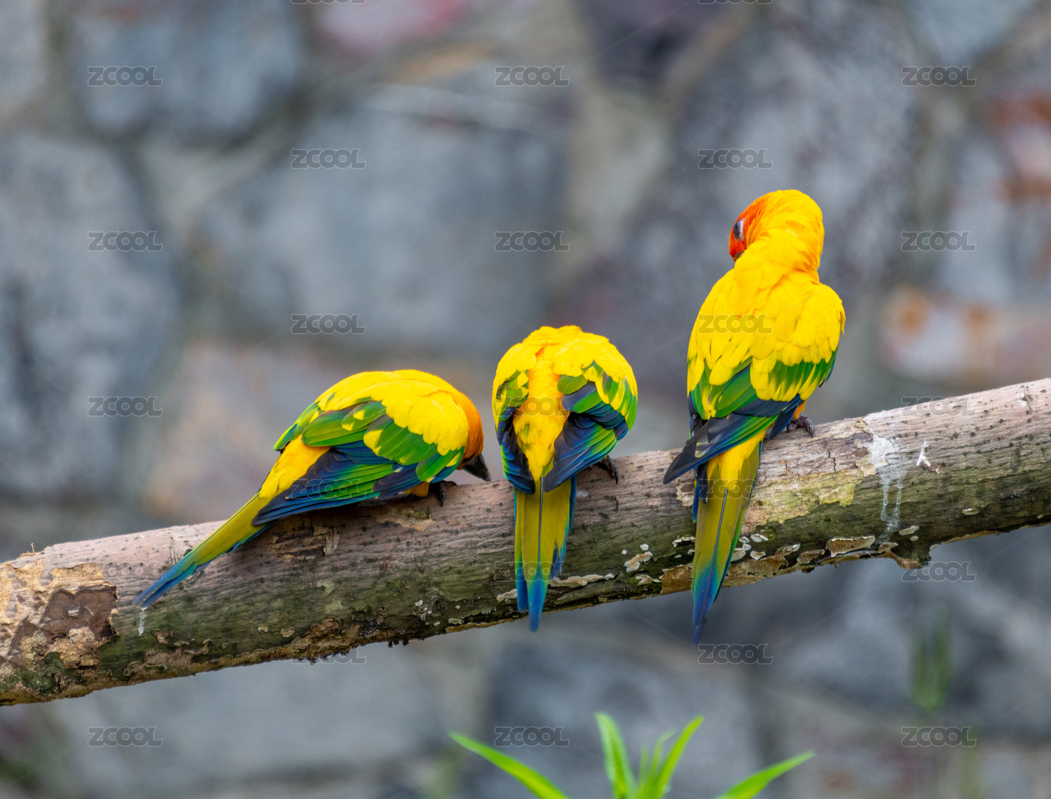 樹枝上黃綠相間的太陽錐尾鸚鵡