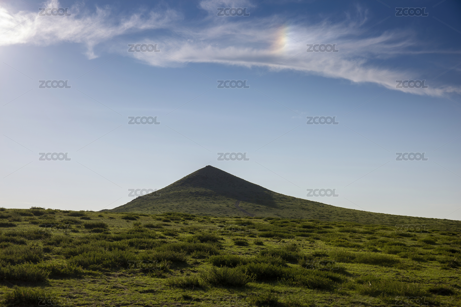 夏季草原上的火山地貌和天空云彩上的彩虹