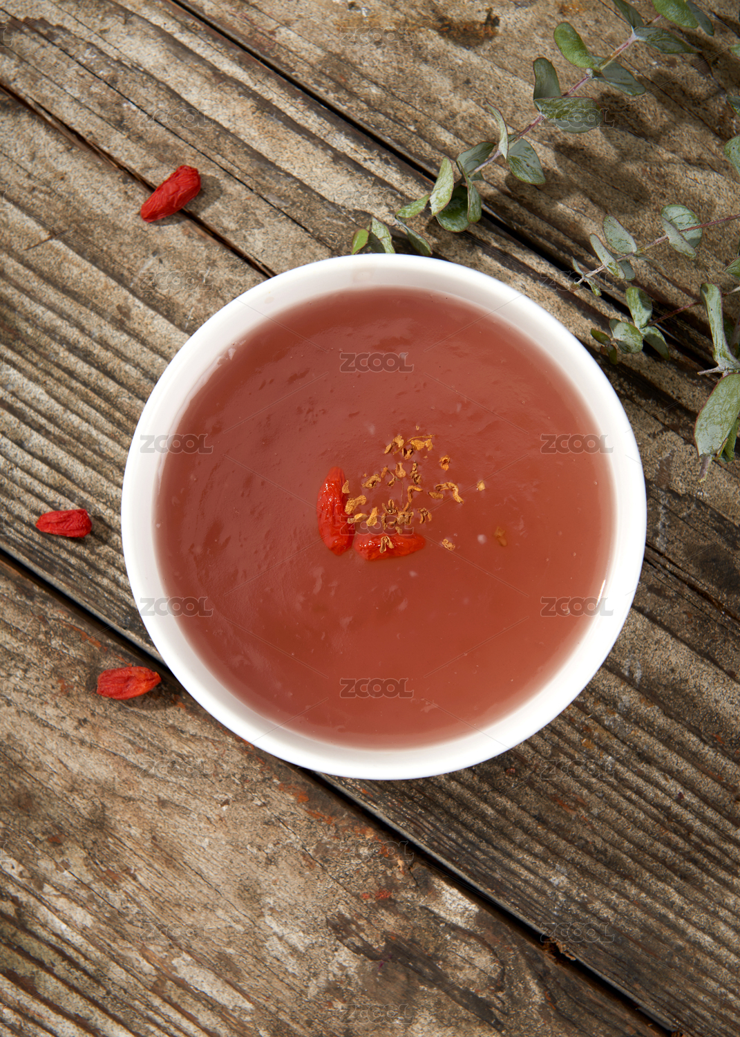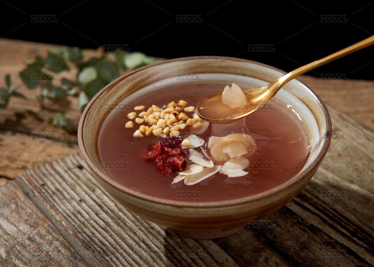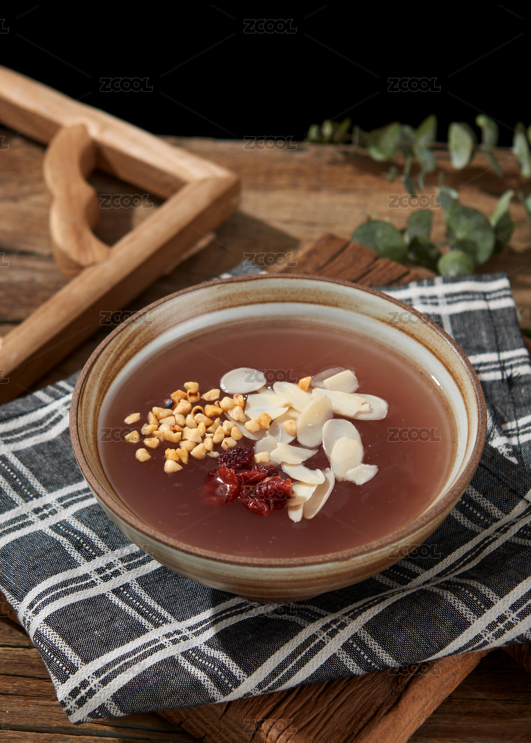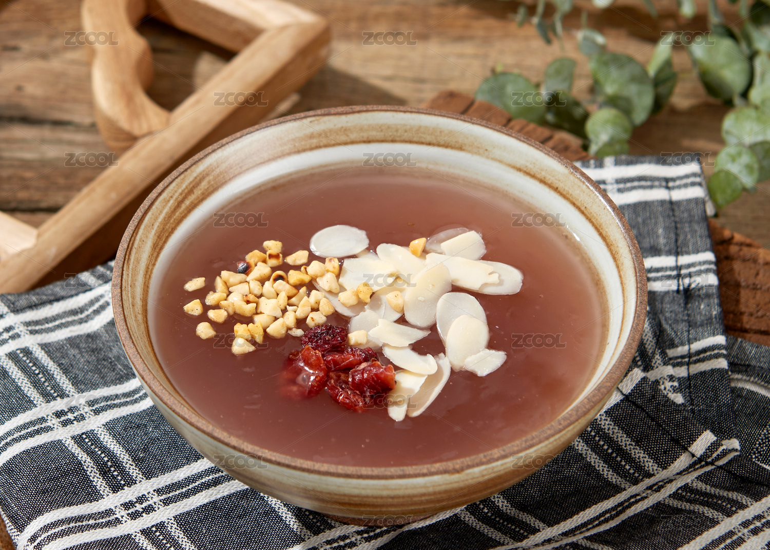 白背景上擺放的沖泡好的藕粉杏仁茶