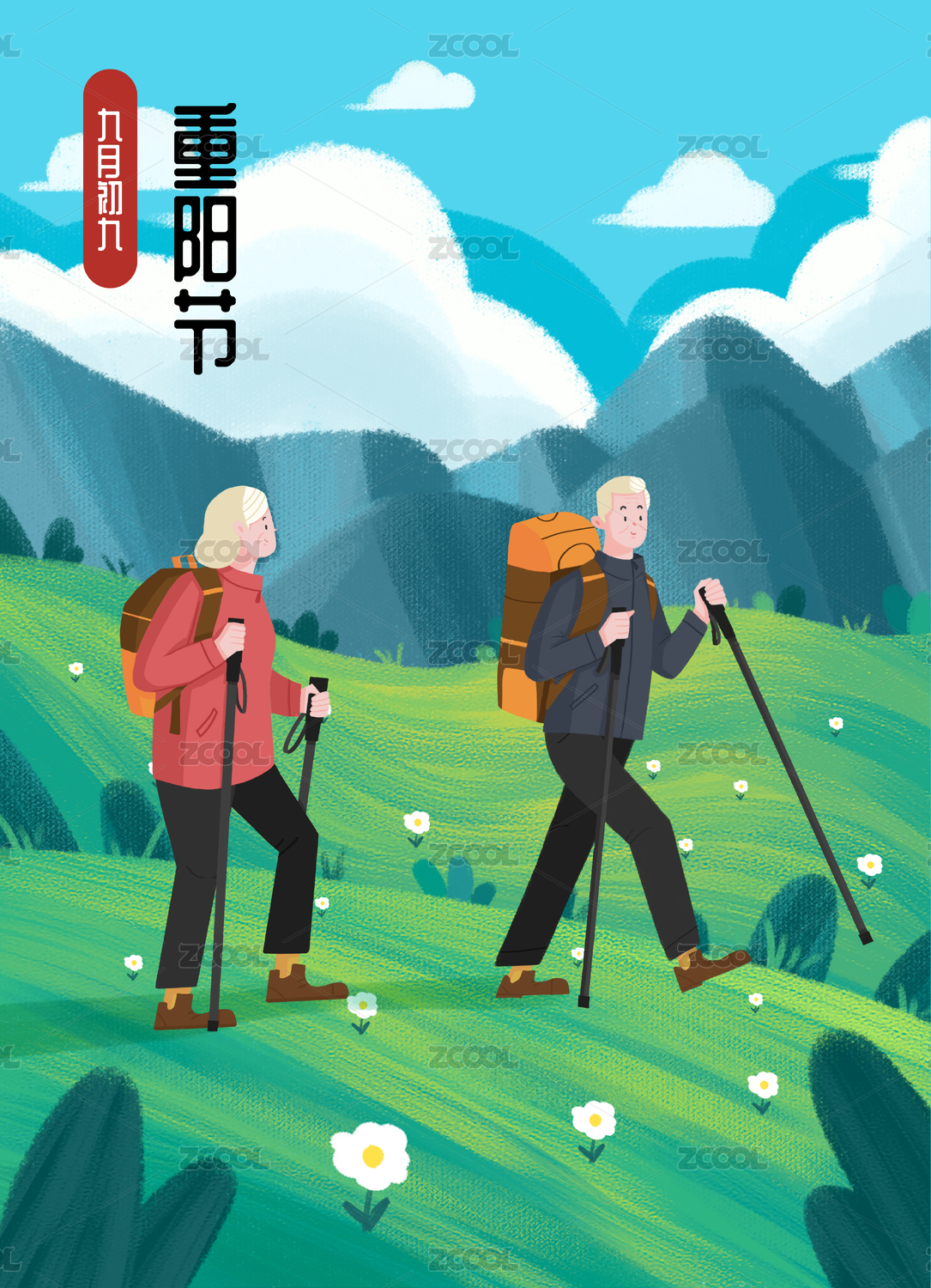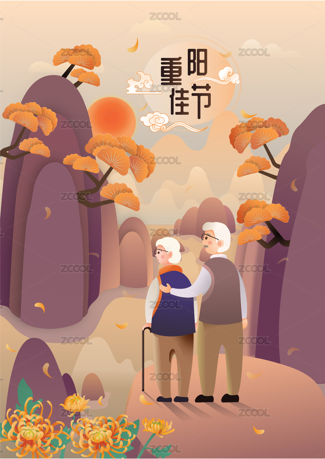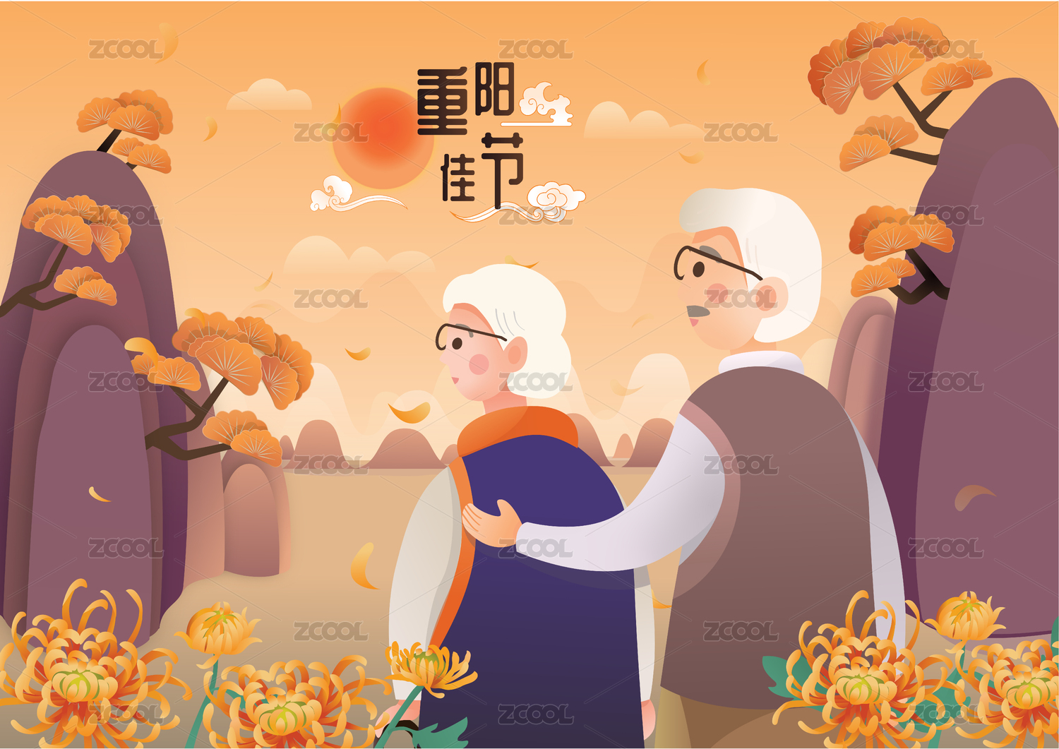 重陽(yáng)節(jié)一對(duì)老人登高望遠(yuǎn)矢量插畫海報(bào)素材