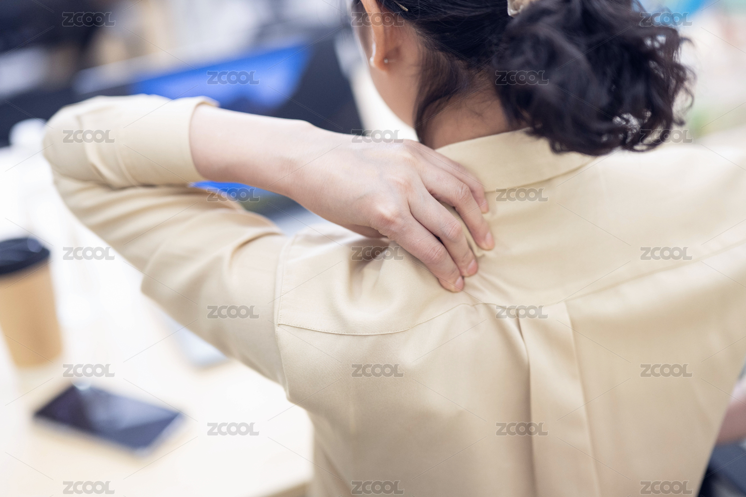一個摸著揉著自己疼痛而又酸痛的腰的腰間盤突出的中國亞洲女人