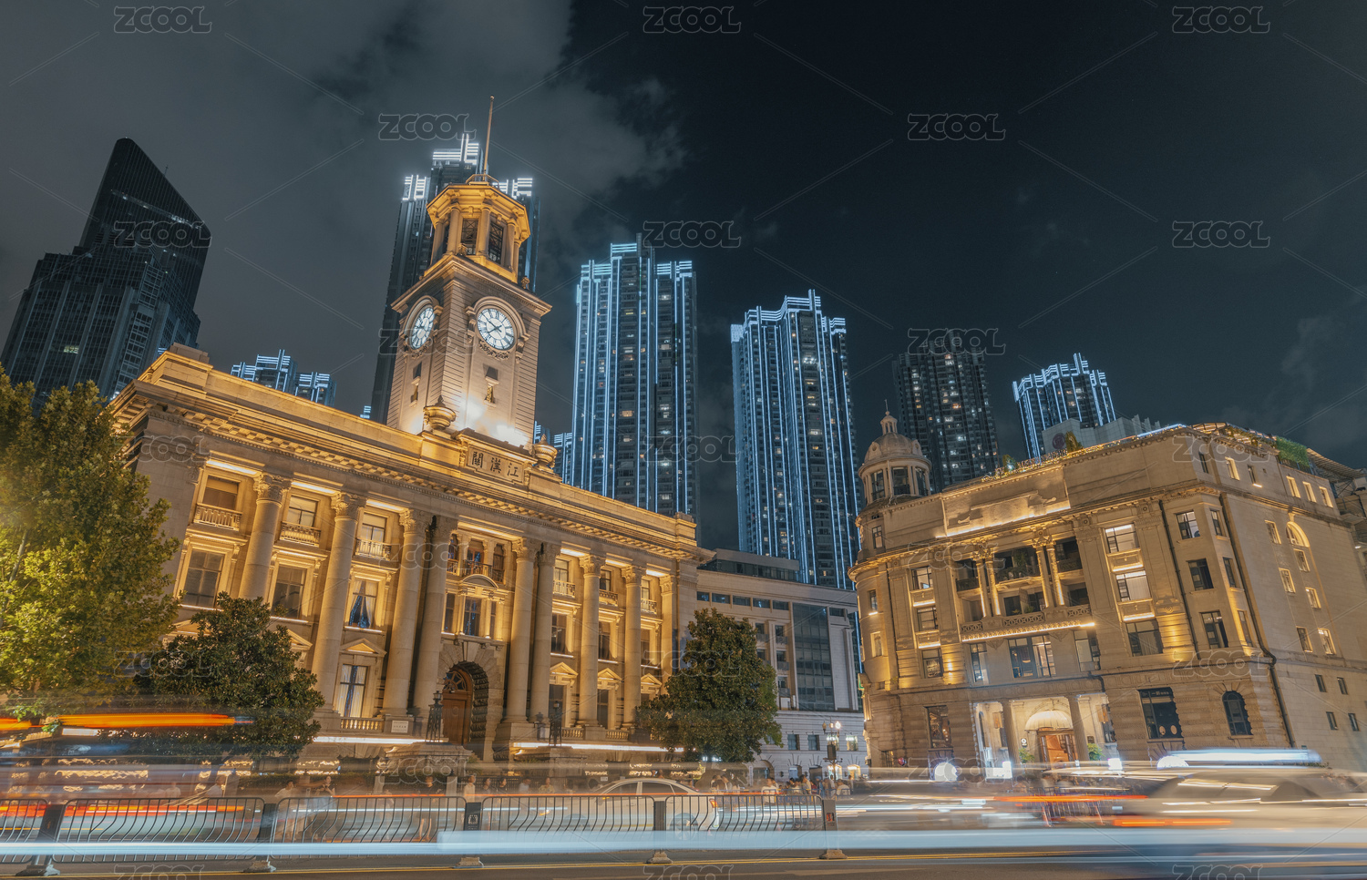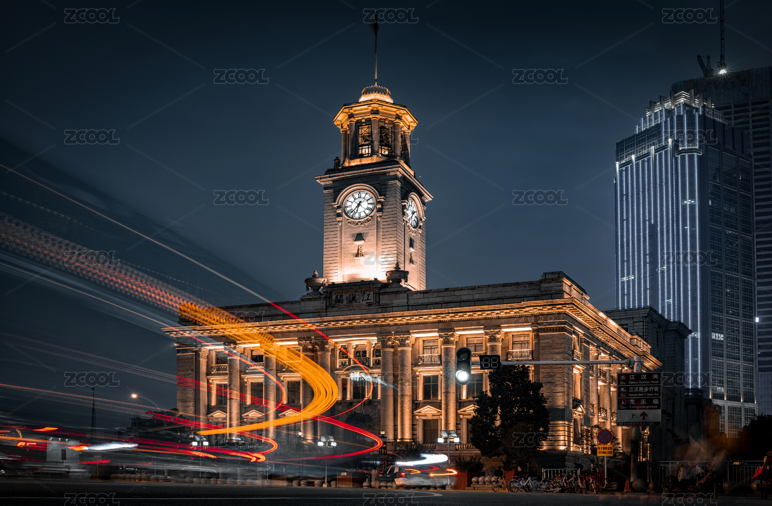 武漢江漢關(guān)大樓鐘樓夜景車流